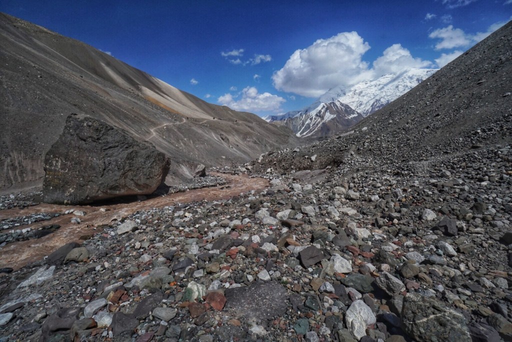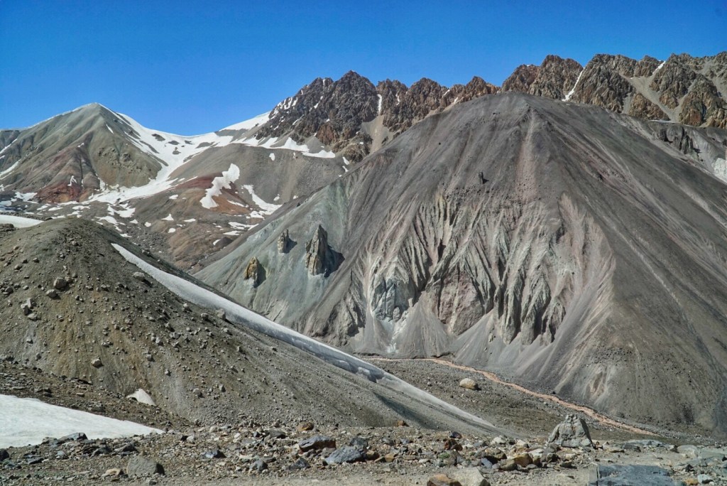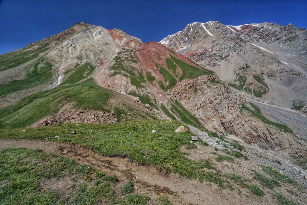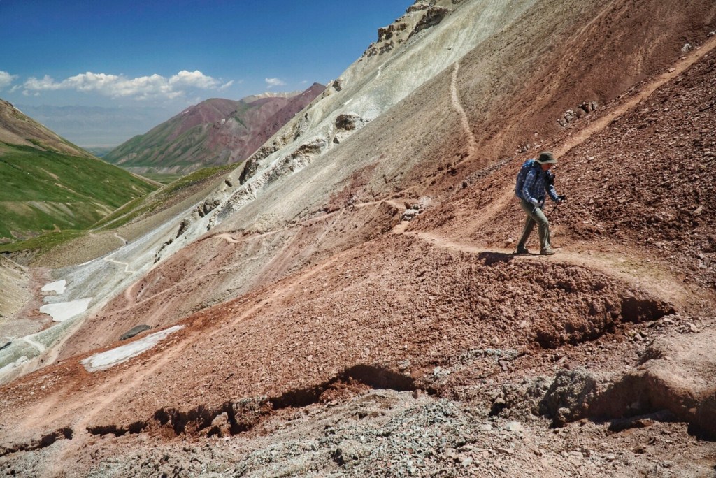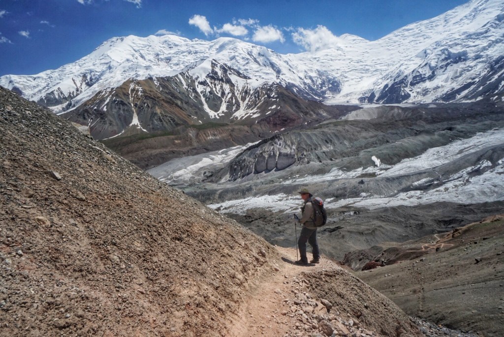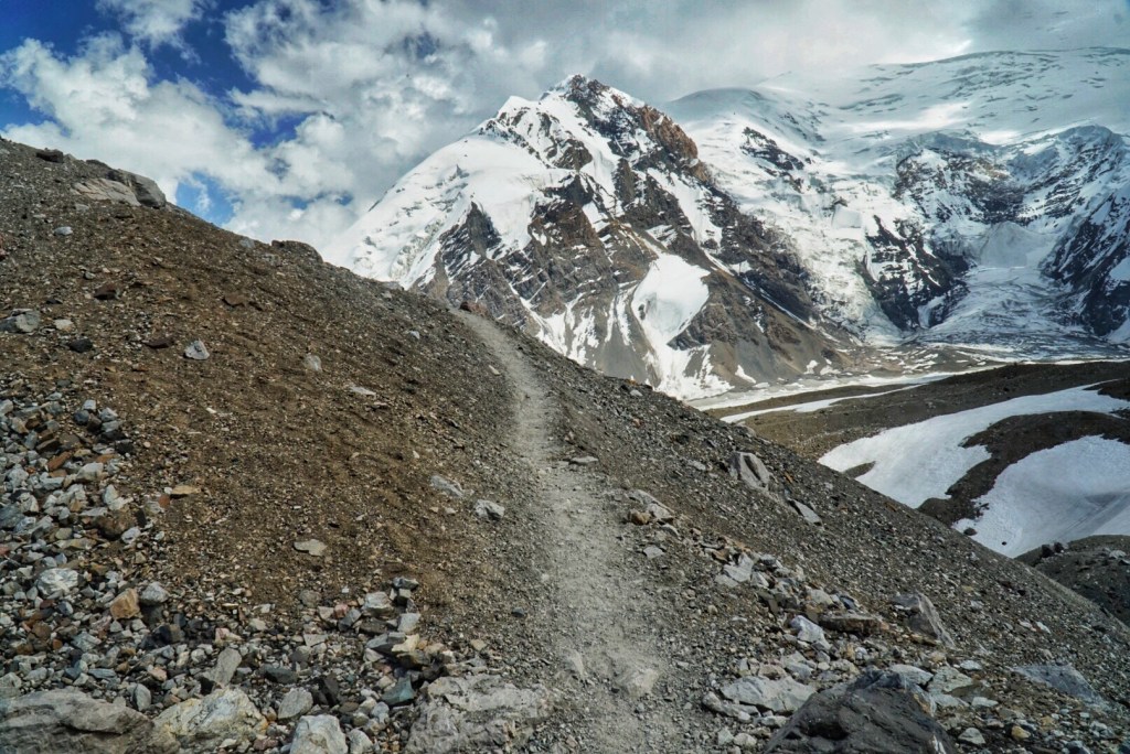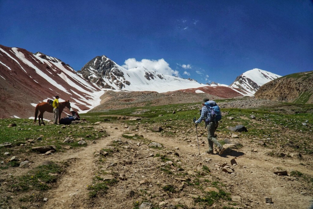 This section of the trail is a little bit of choose your own adventure, depending on how steep or how long you want to hike. Our horseman takes the long route, but his horse has some trouble with a snow patch and stumbles awkwardly. Luckily, they both appear to be alright and continue on. The footing doesn’t look too bad on the slope, so we take the medium-steep route. The steepest routes seem to be reserved for climbers on their way down from summiting Peak Lenin.