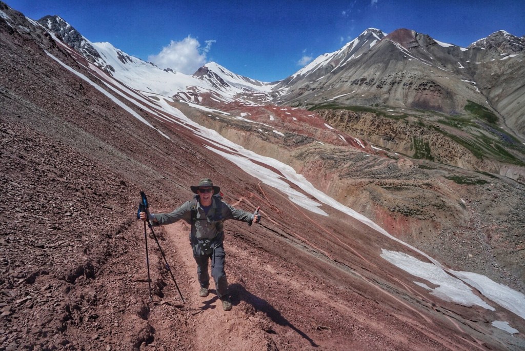 It’s hard to describe how impressive the view in front of us is, but I will give it a try. In front of us, a long row of glacier-covered peaks dominate the scene, and, just to our right and left, rainbow-colored mountains add to the drama of the landscape. There is a steep drop off just below us, and, at the bottom, a long, rock-covered glacier fills the entire valley, a frozen river of ice, anchoring the entire scene. We have hiked in a lot of places all over the world, and this particular mountain-scape has to be one of the grandest we have ever seen.