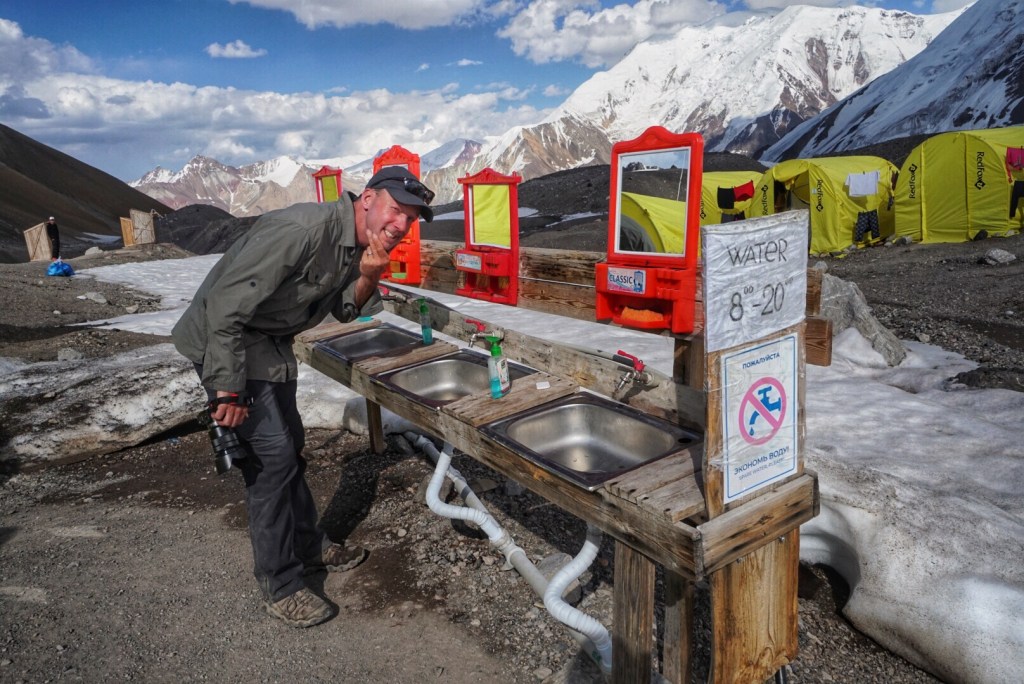 After a bit of a rest, we make our way to the dining tent for some tea and coffee. Along the way, we get a better sense of all the amenities on offer up here at Ak-sai Camp. There is a station of four sinks with mirrors with cold running water available from 8 am-8 pm.