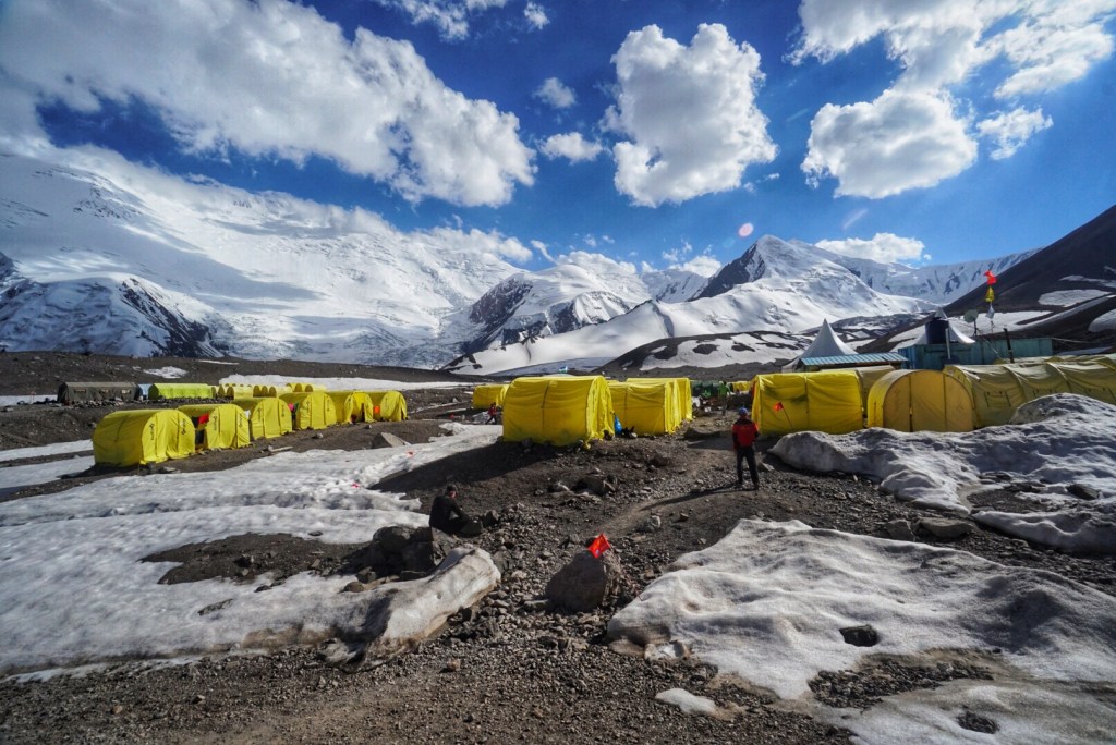 We all meet up at Camp One, a seasonal tent settlement for climbers making their way up to Peak Lenin. This particular camp is run by Ak-Sai Travel, and there are about 50 bright yellow 2-person tents set up, side-by-side and organized into little lanes.