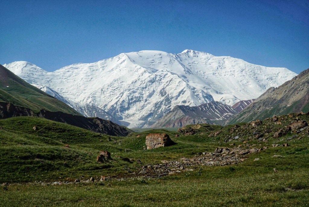 After breakfast and packing up at our Sary Mogul guesthouse, we load into two cars to drive to Peak Lenin Base Camp at Lake Tulpar-Kol. We drive through the village of Sary Mogul, which is a lot bigger than we first thought, and then pick up a dirt road that takes us straight across the grassy plain towards the mighty peak.