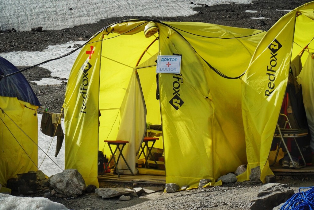 We pass a little lounge area with benches made out of wooden crates where climbers are on their phones using the WiFi offered in camp for $5/hour. In the bar tent, you can buy sodas, beer, wine and vodka at roughly American prices, which isn’t too bad given our location. A shipping crate has been converted into a kitchen to feed the camp residents, and everyone eats meals in large, communal dining tents. There is even a sauna which can be rented by up to four people for $25/hour.