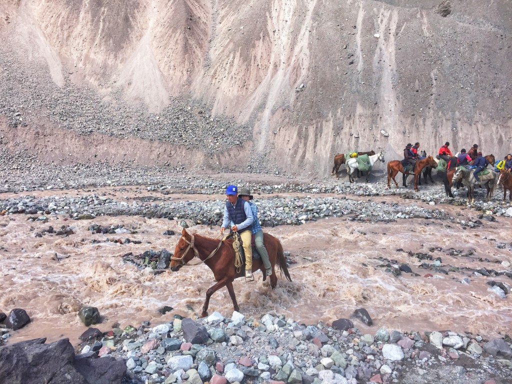 From the river, we climb steeply up to a stark, rocky plateau. The trail is fairly flat here, and we make good time heading to Camp One. We have one last obstacle before being done for the day. The trail drops down to a river crossing, and it doesn’t look too bad from above. There are many braids in the river, and each little section is simple enough to hop across.