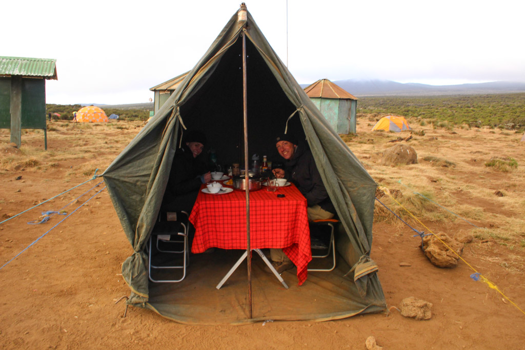 We crested a ridge just past midday and began our descent toward camp at Shira 1. After washing up (a basin of hot water is provided at the end of each day for rinsing our face and hands as there are no showers on the trek), we spent the afternoon relaxing in the dining tent, playing cards and catching up on our journals.
