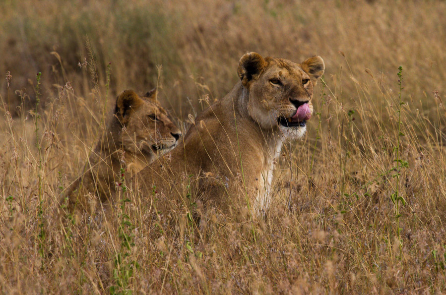 Just before sunset, we came across another pride of lions, sleeping in the grass. For the most part, the group of 10-14 lionesses and juvenile cubs were spread out and laying low, so it was hard for us to get an accurate count of just how many there were. A pair of lions suddenly poked their heads up, alerting us to a lioness approaching. Their keen interest in her return made us wonder about the solo lioness and her status in the pride.