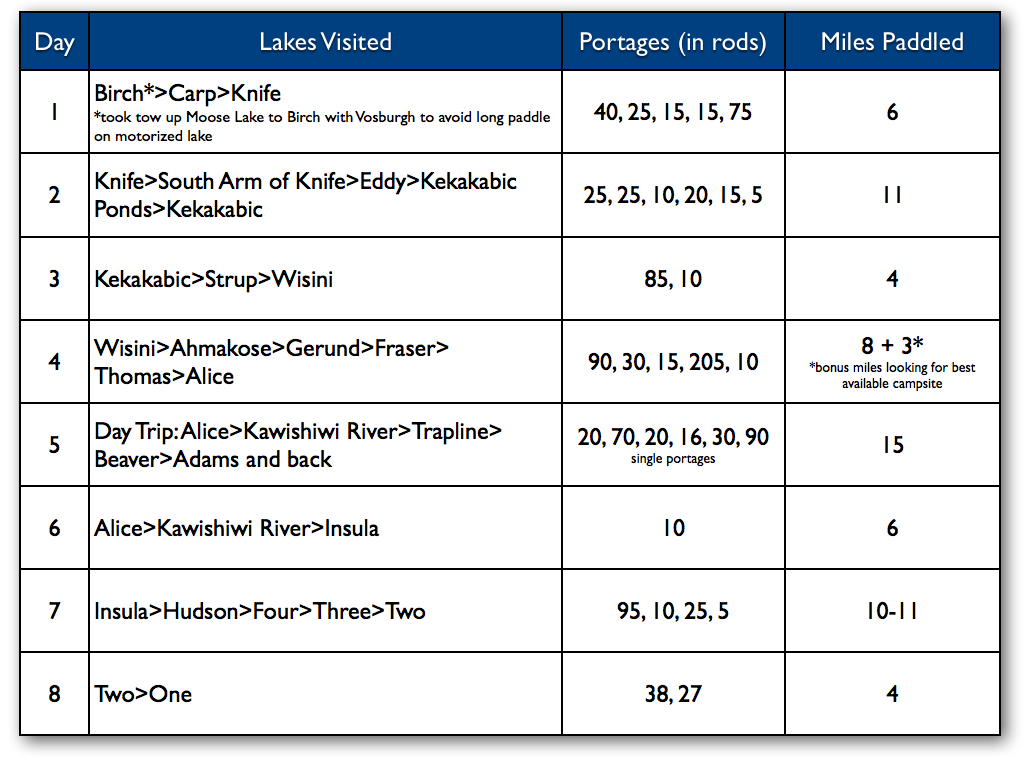 This year, we opted for a more ambitious trip and started all the way to the north at Moose Lake, eventually finding our way out at Lake One. It was kind of a super-route that combined the far northern, eastern and southern portions of this area of canoe country. The following is a day-by-day breakdown of our itinerary, including the lengths of portages we encountered as well as an estimate of the miles paddled.
