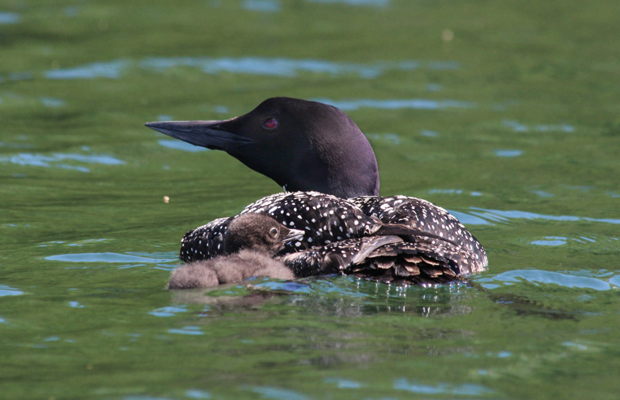 A far more common and congenial subject is the loon. It seems like every lake has a resident pair, and, if you are lucky, this beautiful bird will tolerate your presence and allow some good photo opportunities. This year the loons didn’t seem quite as numerous in years past, but we did run into one pair feeding with a young chick. One parent would stay at the surface with the chick while the other would dive for fish and bring back a tasty fish for the little one.