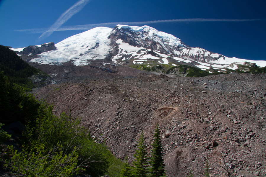 We continued our pleasant downhill through the fern forest to a lookout to the Winthrop Glacier with its raging glacial run-off that becomes the west fork of the White River. Seeing a glacier up close and personal like this is mind-blowing. While the visible ice face is impressive in itself, it only hints at the massive glacier located below the rock-covered surface.