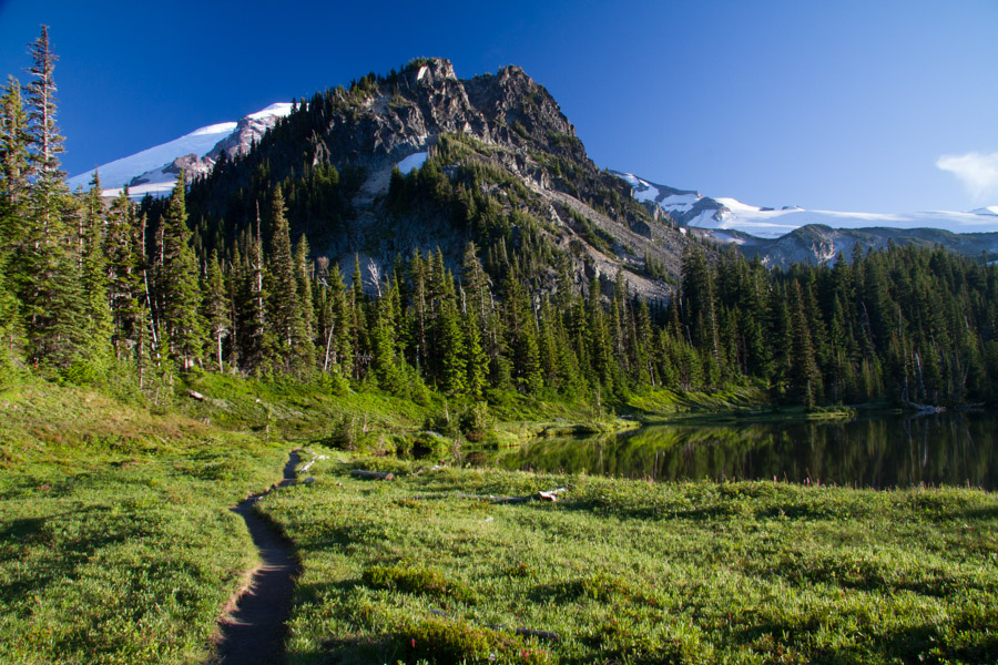 We began our Wonderland adventure traveling counter-clockwise on the north side of Mount Rainier from White River Campground heading toward South Mowich River. Filled with sweeping vistas, enchanting alpine meadows, photogenic lakes and a few hair-raising bear encounters to boot, this alluring section of the trail was the perfect introduction to the Wonderland—a magnificent visual feast from beginning to end. It had us at hello…