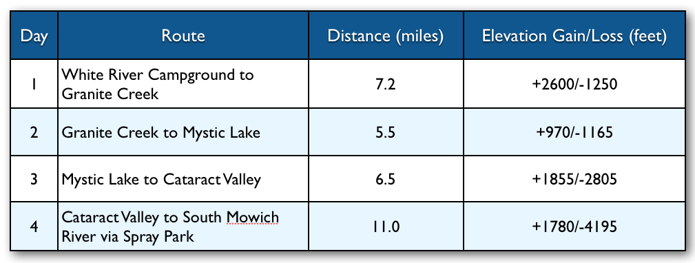 Day One: White River Campground to Granite Creek, 7.2 miles