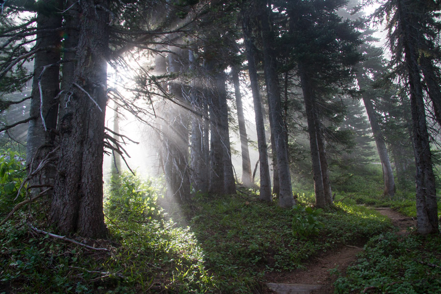 When we finally arrived at the high point of the trail (5930 ft), a thick layer of clouds had rolled in, and everything but the base of the magnificent Rainier was concealed. The trail dropped a steady 800 feet through alpine meadows where all of the usual suspects including lupine, neon pink paintbrush, heather, and hippies on sticks (the seed pod of the western anemone and a personal favorite) were out in full force.