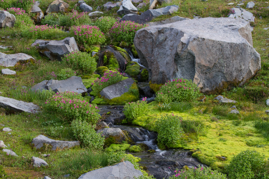 The trail descended steeply at first and crossed a few more snow fields before dropping into the neon green alpine meadows of Summerland (5940 ft), our last backcountry camp of the trip. The area surrounding Summerland was very picturesque with pleasant meandering streams lined with monkey flower and pink heather, plump marmots frolicking about and close up views of Rainier and Little Tahoma.