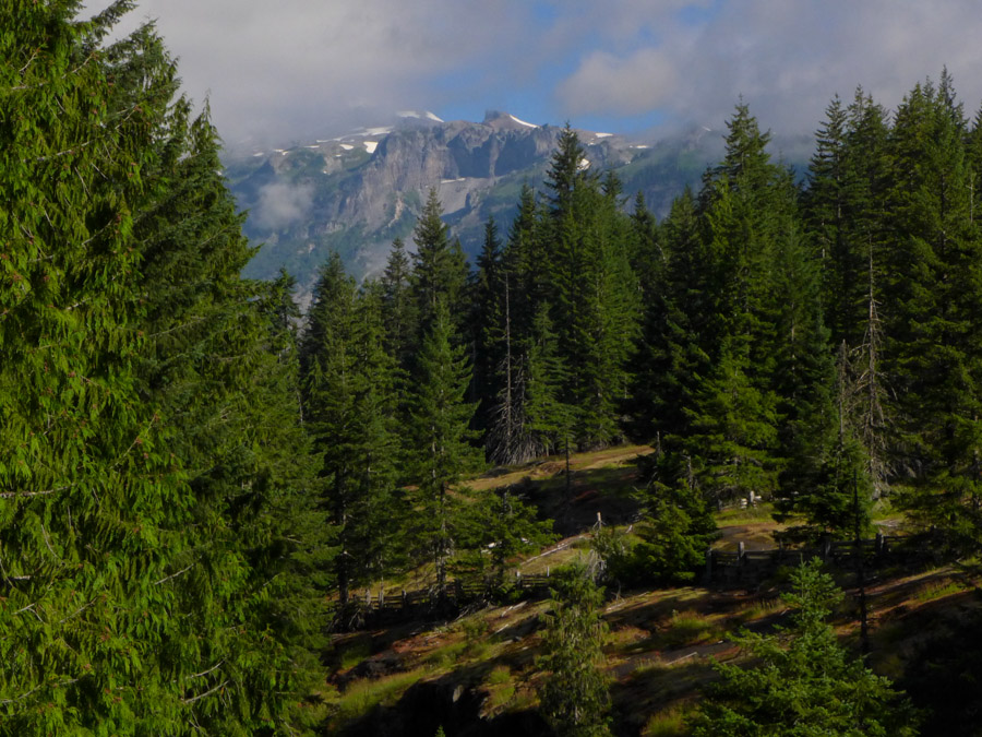 After Box Canyon, it was a grueling uphill slog through the forest. The trail gained 2500 feet over 3 long miles that felt like they would never end. We looked for interesting distractions along the way to help take our mind off the climb and were relieved to finally break out of the forest and reach Cowlitz Divide.