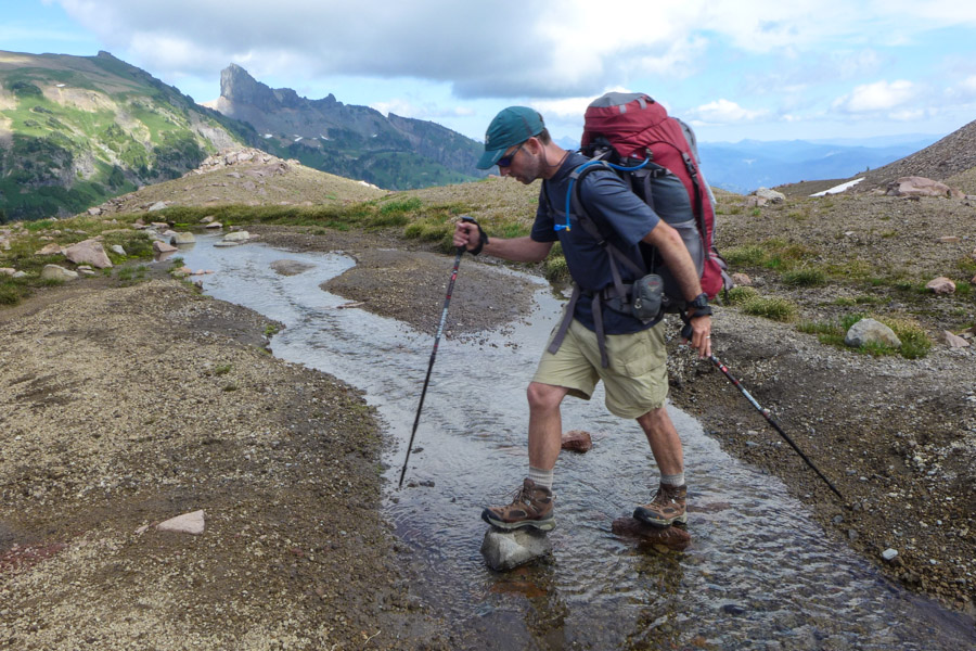 Unfortunately, we ran into some camera trouble on our way back to camp. Every time we tried to take a picture, our DSLR indicated that we had a problem with our lens. With know idea how to solve it, we reluctantly packed our camera away and made good time getting back to Indian Bar. After a quick lunch, we broke camp, bid farewell to Indian Bar and started making the arduous ascent to Panhandle Gap. The trail headed up the creek to an overlook of the valley. We followed the switchbacks through flowery meadows, enjoying occasional glacier views. Eventually the meadows gave way to slate and volcanic rock, and the scene became increasingly impressive.