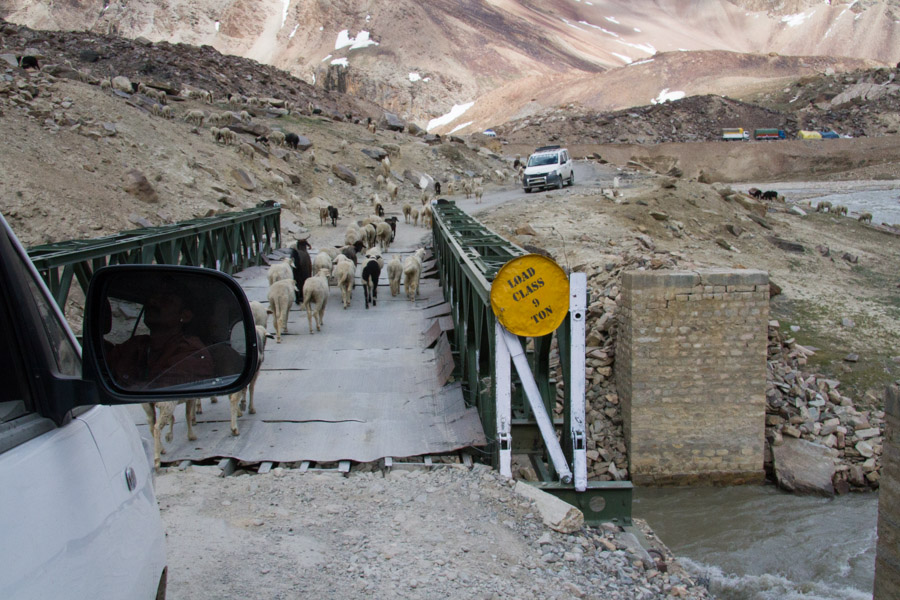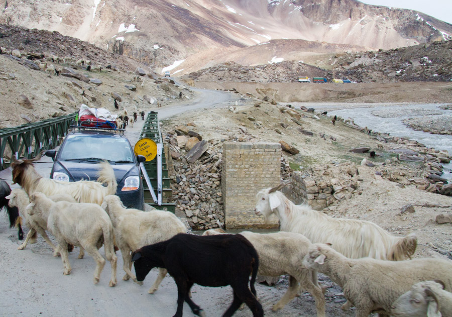 The Leh-Manali Highway is only open for about four months each year when the road is free of snow. From time to time we had to “ford” streams of glacial melt water flowing right over the road.