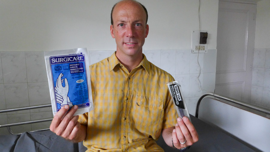 So three hours later (the doctor only does surgeries after lunch!), Matt checked into the hospital. A nurse visited the room and gave me a shopping list of medical supplies the doctor would need for the surgery: syringes, gloves, the local anesthetic, etc. I ran to the on-site pharmacy and came back with a paper bag filled with all of the goods. I kid you not!