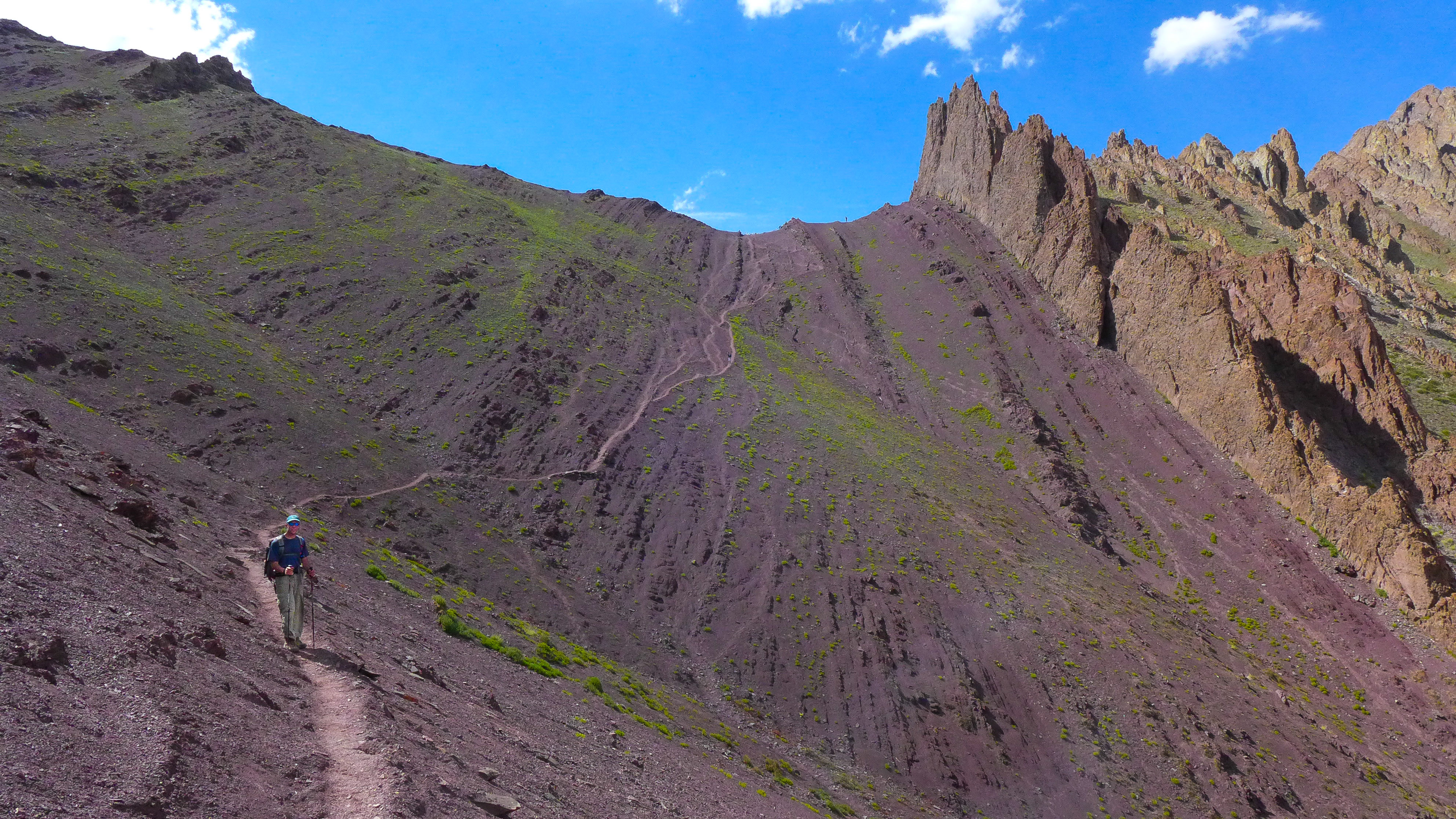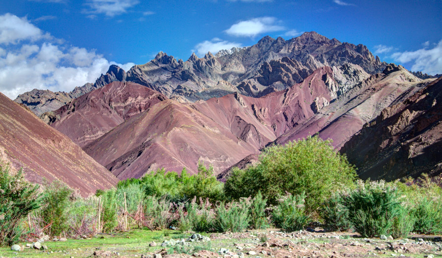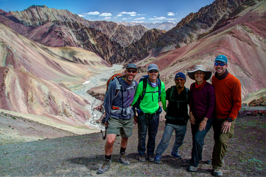 We started our traverse of the Stok mountain range in the early afternoon at a small Buddhist temple, where we each walked around the prayer wheel to foster good karma on the trail. For the next few hours, we walked along a fairly level road which followed a picturesque river before arriving at our camp for the evening. The colorful mountain backdrop was stunning and whet our appetite for the amazing landscapes we would see on the days to come.