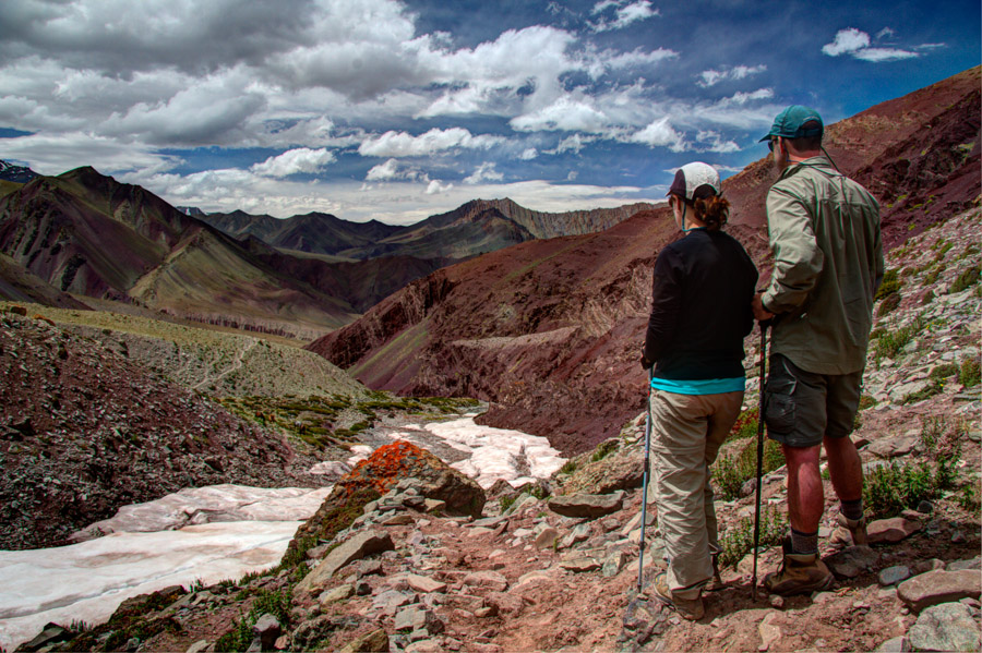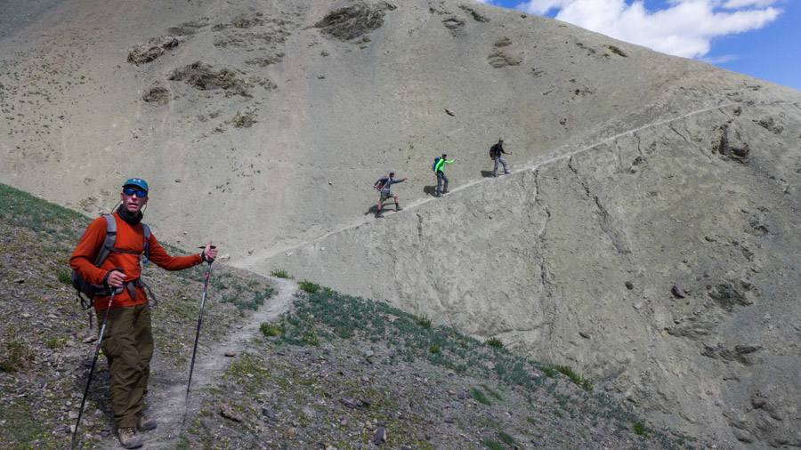 “There’s another pass?,” we asked incredulously, as we stood at the top of Stok La (4860 meters/15,940 feet) and stared at the sheer, vermilion-colored wall of rock still ahead of us. Our hearts sank as our gaze followed the narrow footpath climbing vertically at a nerve-wracking angle to the saddle-shaped pass ahead. “You’re kidding, right?”
