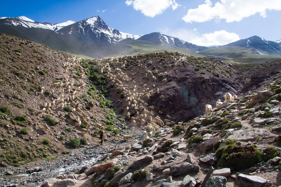 It was a beautiful morning as we set off on an ambitious day trip requiring a 1000-meter ascent up an expansive meadow toward snowy Matho Kangri. Once there, we hoped to practice using crampons in preparation for a summit of Stok Kangri. Still struggling to acclimatize to the high elevations of Ladakh, we were humbled when we were easily overtaken by a huge herd of grazing sheep.