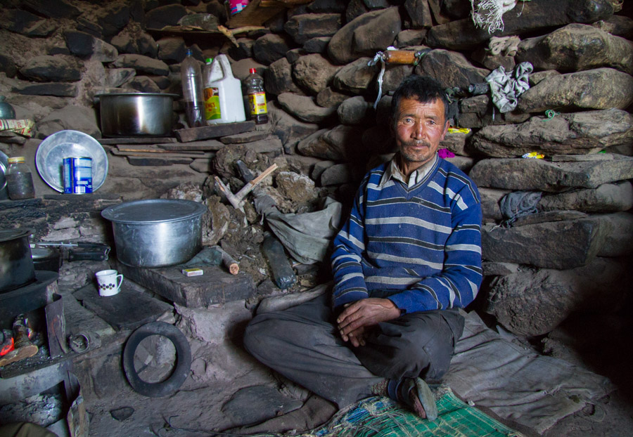 For breakfast this morning, we were treated to delicious fresh cheese and yogurt made by the shepherds living in the camp adjacent to ours. We asked Angchuk if it would be possible to pay a visit to the camp before hitting the trail, and much to our delight, the three shepherds living in the summer camp were willing to give us a tour. Their living quarters were tiny stone hovels, and it was fascinating to see how they managed to dwell in these rustic conditions for months on end. They allowed us to visit their sleeping quarters/kitchen and showed us how they boil the sheep’s milk into yogurt for making cheese and lassis. Before our departure, they insisted we taste a few pieces of churpe, slightly sour, dried cheese that Ladakhi shepherds like to snack on while pasturing their sheep. Our hosts told us it would give us good energy on the trail, so we happily accepted a handful of the tasty treats for the road.