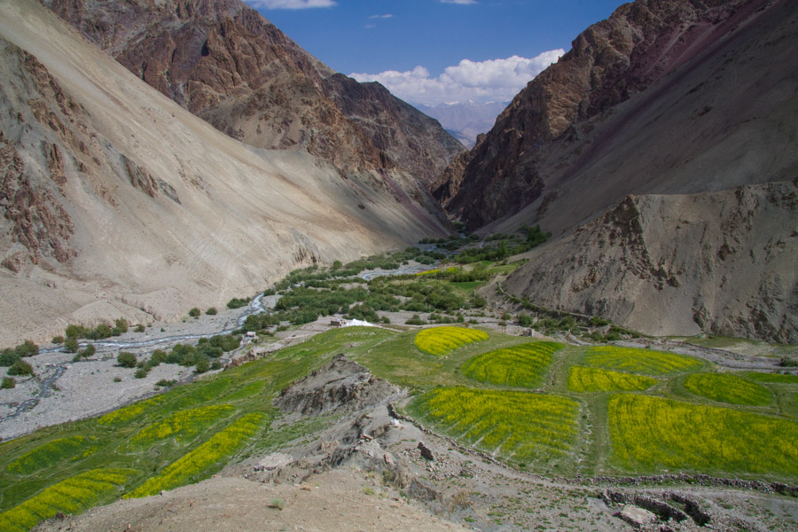 The last great challenge of our Stok Range traverse took us on a day trip outside of Rumbak Village to Ganda La Pass. We set off around the corner from Rumbak and headed down to a broad rocky river bed where we crossed several small streams and zigzagged our way across the valley. We made a gentle ascent along the valley until the trail split to our right. From there, we hiked past striking green and maroon colored rock formations and eventually through the one-house hamlet of Yungtse. Farther on, we enjoyed a rest at a parachute tea house (run by our horseman’s son) before slogging our way up to Ganda La at 4960 meters (16,270 feet).