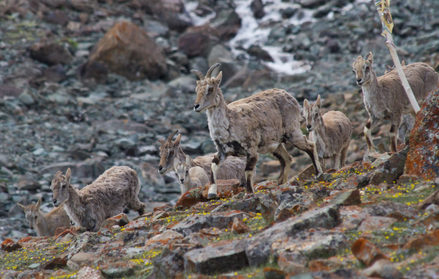 I know this was the right choice for me, but I was still quite sad when Matt set off in the dark of night, knowing that this would be an awesome hiking experience that we wouldn’t be sharing. I spent my morning in camp, photographing the birds and marmots that make their homes in the nearby meadow. I decided to hike up the steep hill above camp to greet the group on their way back from summiting. Just as I hit the trail, I noticed a herd of blue sheep wandering into camp. I raced back to the tent to grab my long lens and spent the next few hours photographing the sheep as they moved through our camp. Later, I was relieved when Matt, Rob and Amy finally returned to camp safe and sound, and I enjoyed hearing about their summit experience.