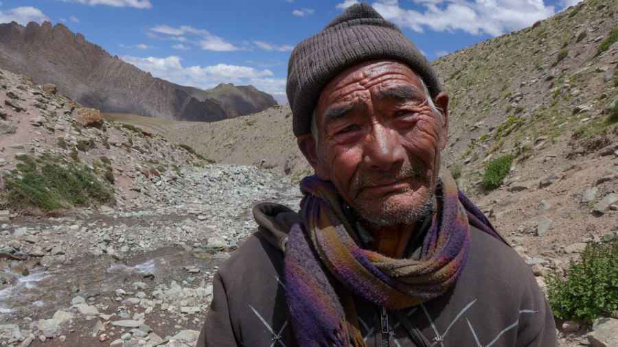 We had a 5-hour leisurely hike up to today’s pass. When we finally reached the top, it felt like we had turned the corner from one picturesque valley into the next with views toward Matho village and the snow-sprinkled Ladakh Range now on the horizon. We crossed two rivers and were photographing a picturesque waterfall when we met a friendly local returning to his village for the evening who was kind enough to pose for our cameras. Back on the trail, we passed two small shepherd encampments on our way to camp, which had been set up in a meadow with awesome views of Matho Kangri, an impressive peak at 5900 meters (19,356 feet).
