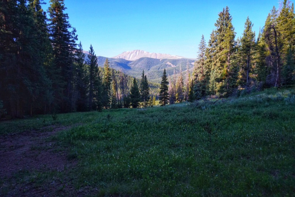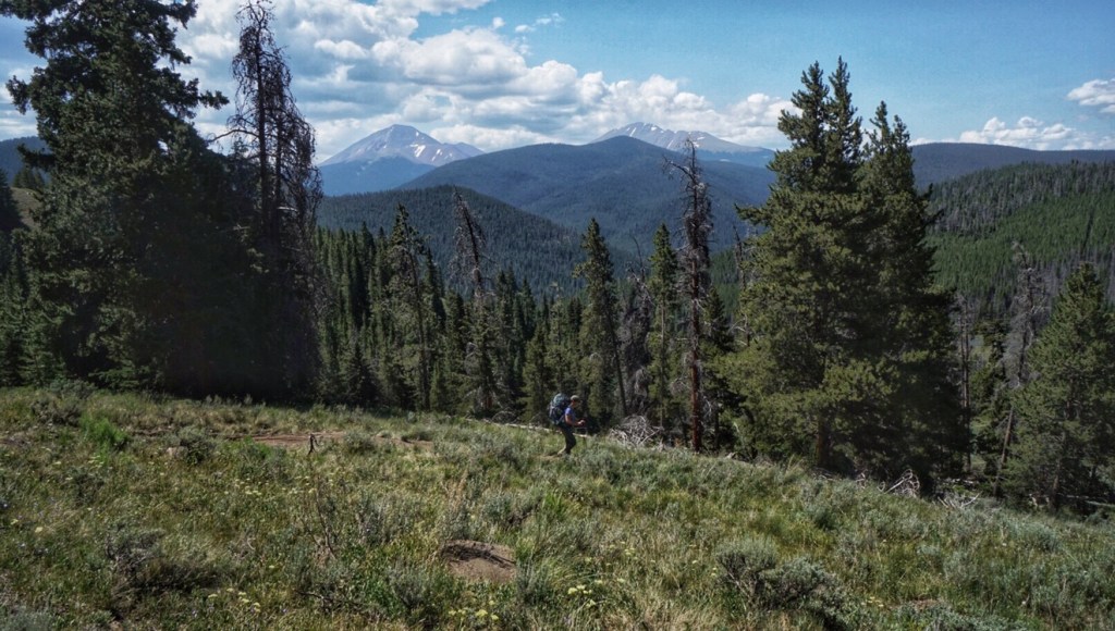It’s a bit cool this morning, and that helps us set a healthy pace as we start a 1200-foot climb over the next 3 miles. The sun is shining and blue skies beckon us forward. We climb steadily through pine forest, crossing a small stream and eventually gain stupendous views over the Breckenridge/Frisco Valley and its surrounding mountains.