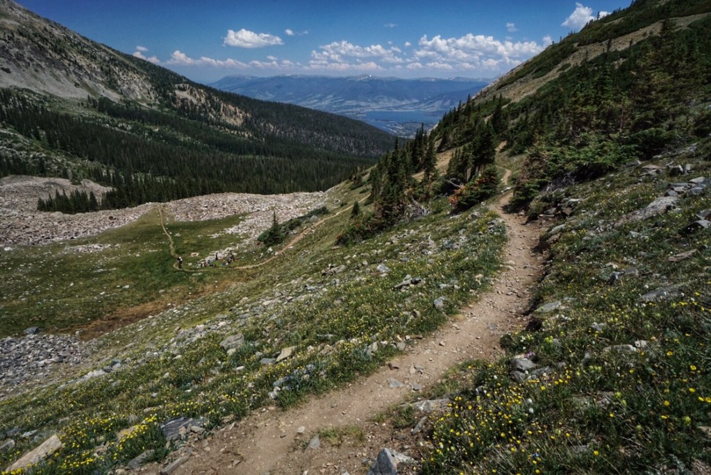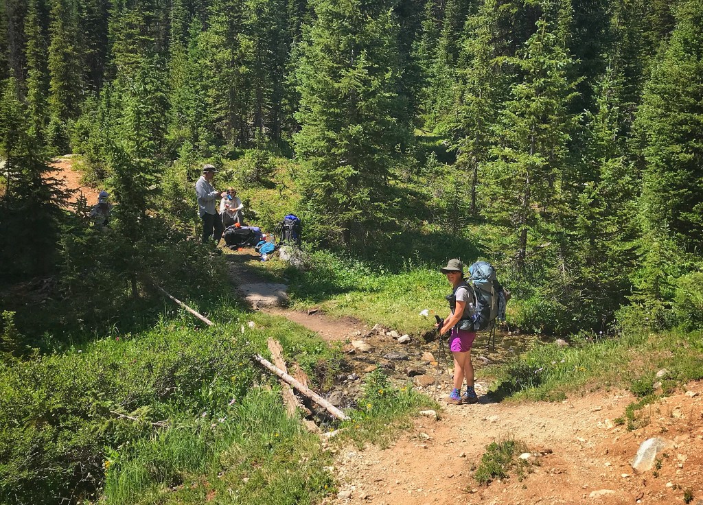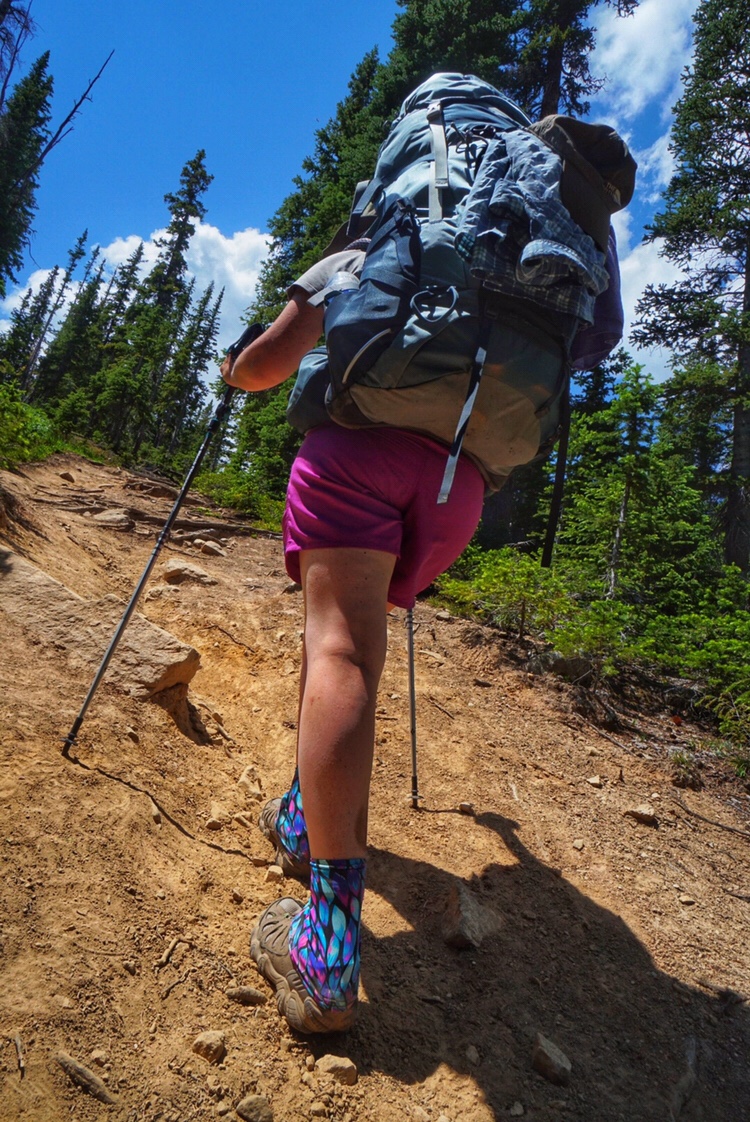 At this point, the trail ascends steeply, and we really have to work hard over the next several miles to make progress. Luckily, the gorgeous wildflowers and mountain scenery keep drawing us forward.