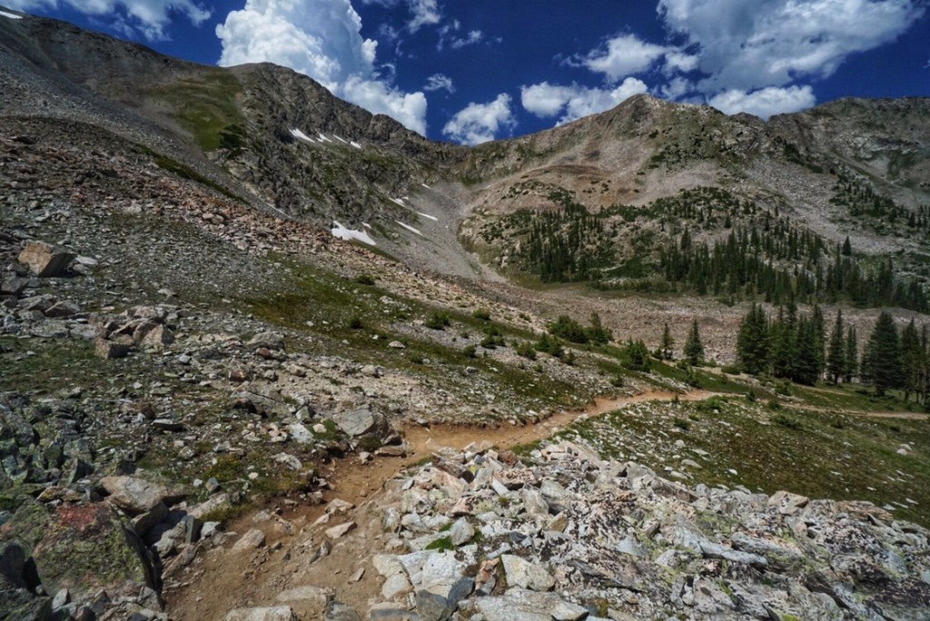 For the next several miles, we work hard as we ascend on switchbacks and crest the Tenmile Range between Peaks 5 and 6. We are exhausted by the effort but rewarded with stunning panoramic views of the surrounding ranges. We see a few picas scampering among the rocks and spy several marmots sunning themselves on the rocks as we walk by.