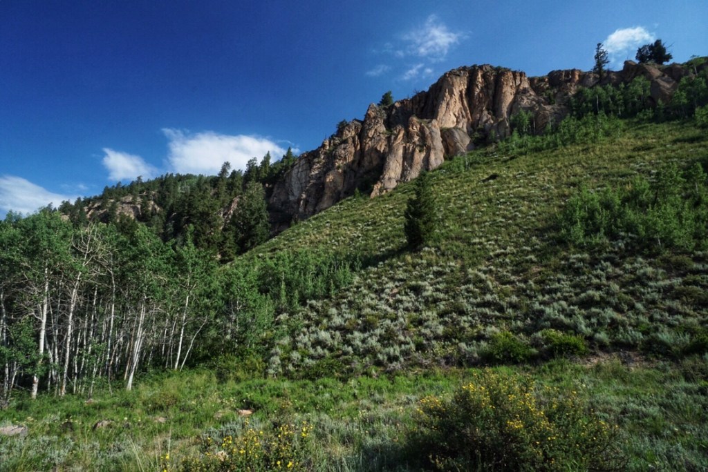 Eventually we cross the road and cross the valley. We pass Camp Hale, an old military training facility. Some of the concrete bunkers remain but have been taken over by swallows. There are also disturbing signs about the dangers of unexplored ordinance, so stay on the trail! Duly noted.