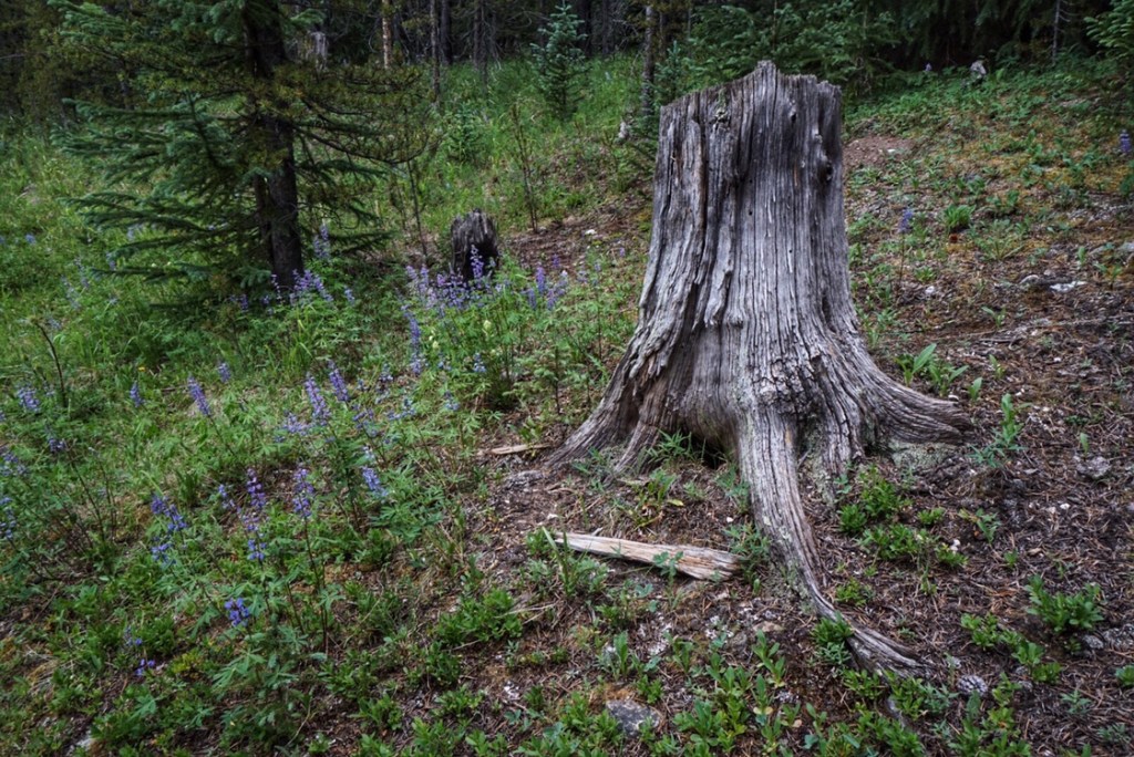 We still have nearly 4 miles to cover before our intended camp for the evening, and it’s hot in the sun down at the pass, so we have plenty of incentive to keep hiking. Off we go, back into the woods, which, at first is kind of spooky—lots of thin pine trees sort of evenly spaced and no greenery.
