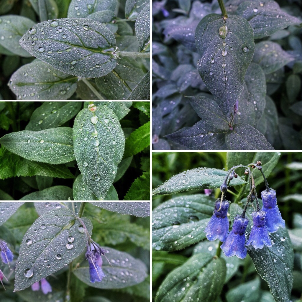 We cross a small creek that is lined with Mountain Bluebell covered in dew from last night’s rain. We can’t resist stopping to photograph the water droplets and the beautiful patterns they make on the leaves and flowers.