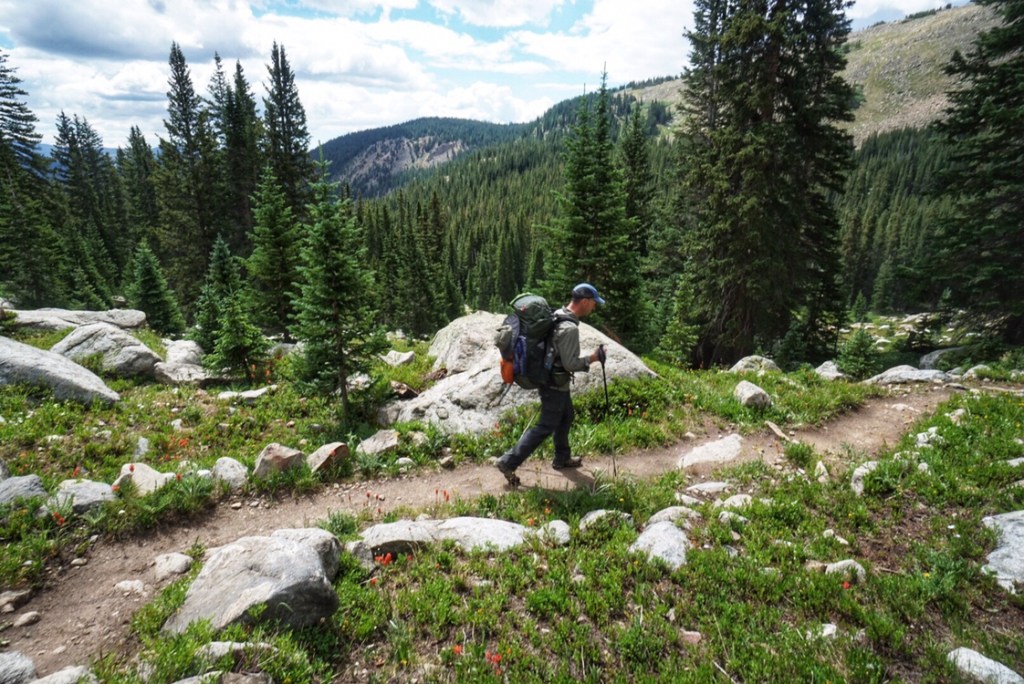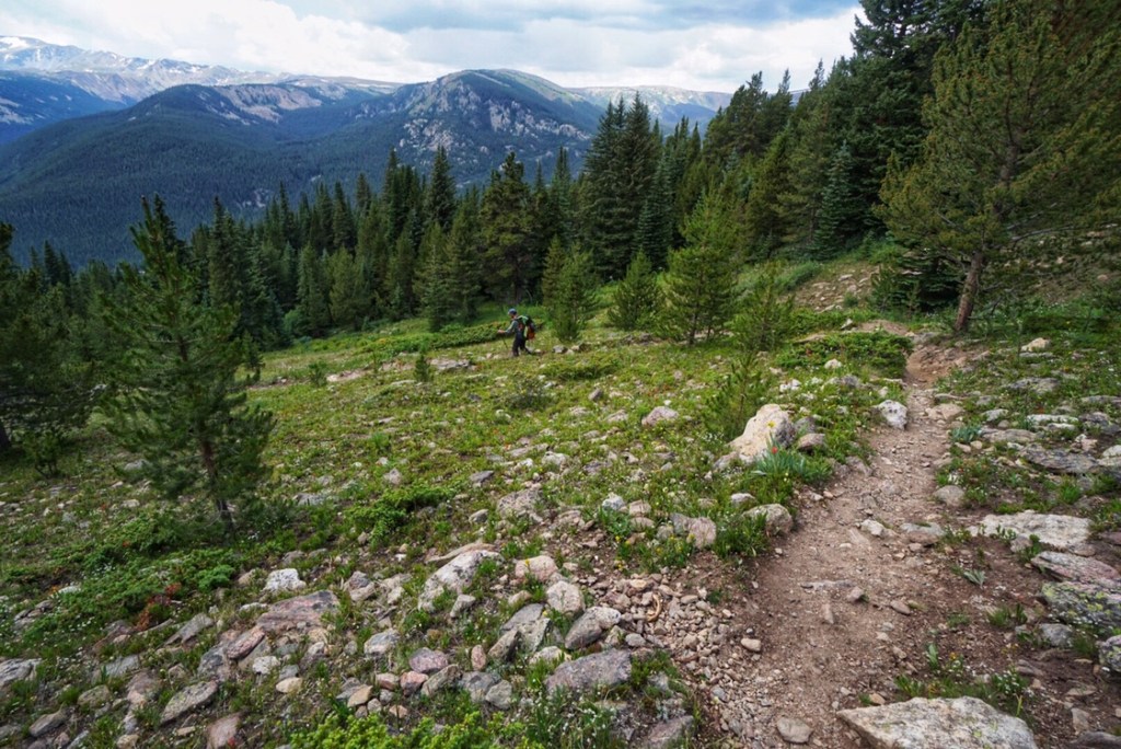 From there we contour the mountainside to reach our highest point of the day at 11,702 feet before beginning the long descent down to the Timberline Lake Trailhead. We lose 1500 feet over the next five miles, stopping to take photos of the beautiful scenery we see along the way.