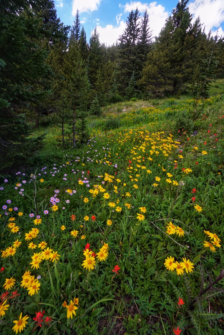 We retrace our steps to pick up the CT again, and we immediately drop down into a vertical meadow of fir trees and alpine wildflowers that practically takes our breath away. Who knew there were so many different shades of Indian Paintbrush?