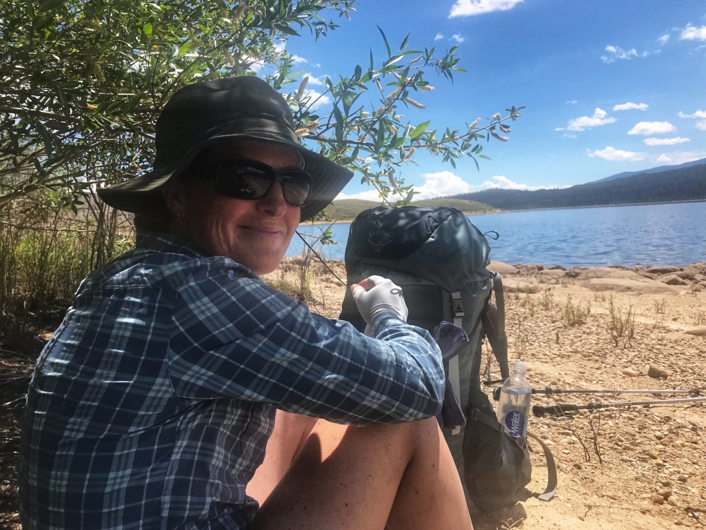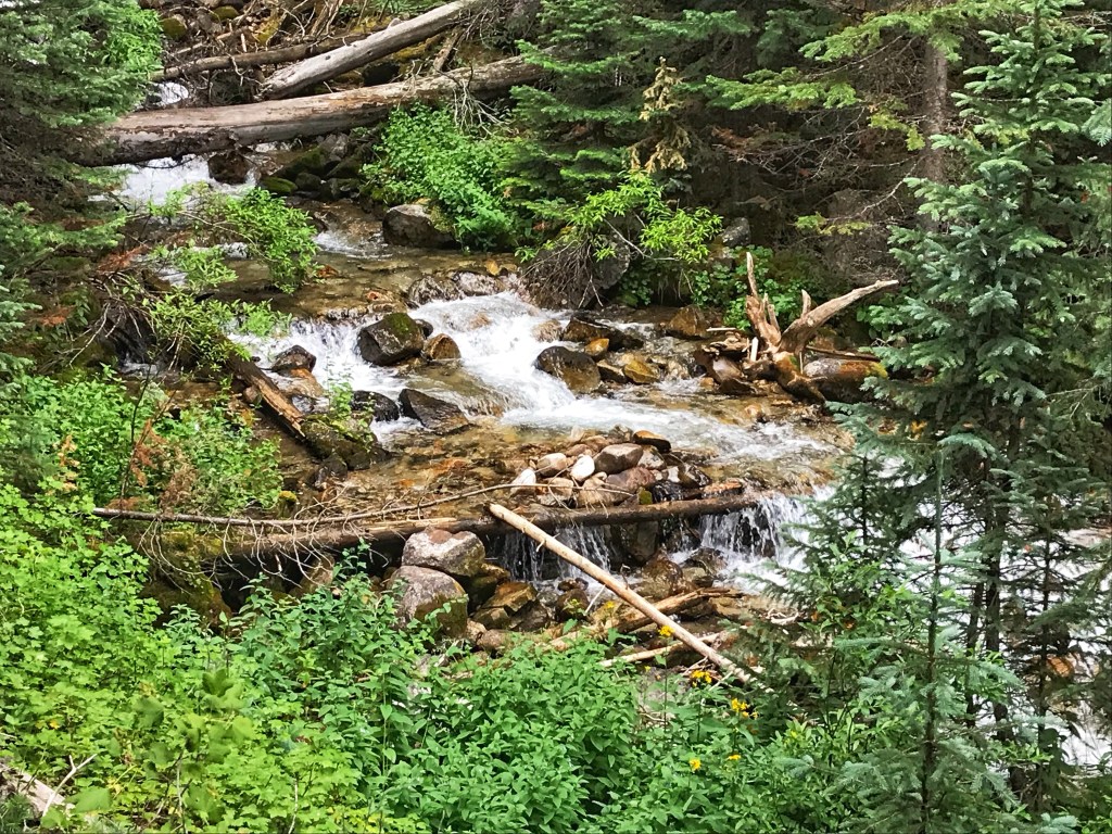 It’s mid afternoon, and we still have 5 miles to cover to get to our intended camp. The trail remains fairly flat for about 2.5 miles, but that’s where the fun ends. The last 2.5 miles or so climb over 1000 feet straight up a gulch with almost no switchbacks. We stop to filter water for the evening so we are back to full pack weight! Aarrggh!