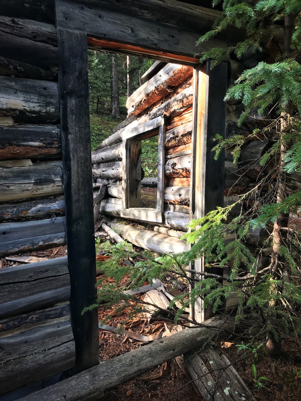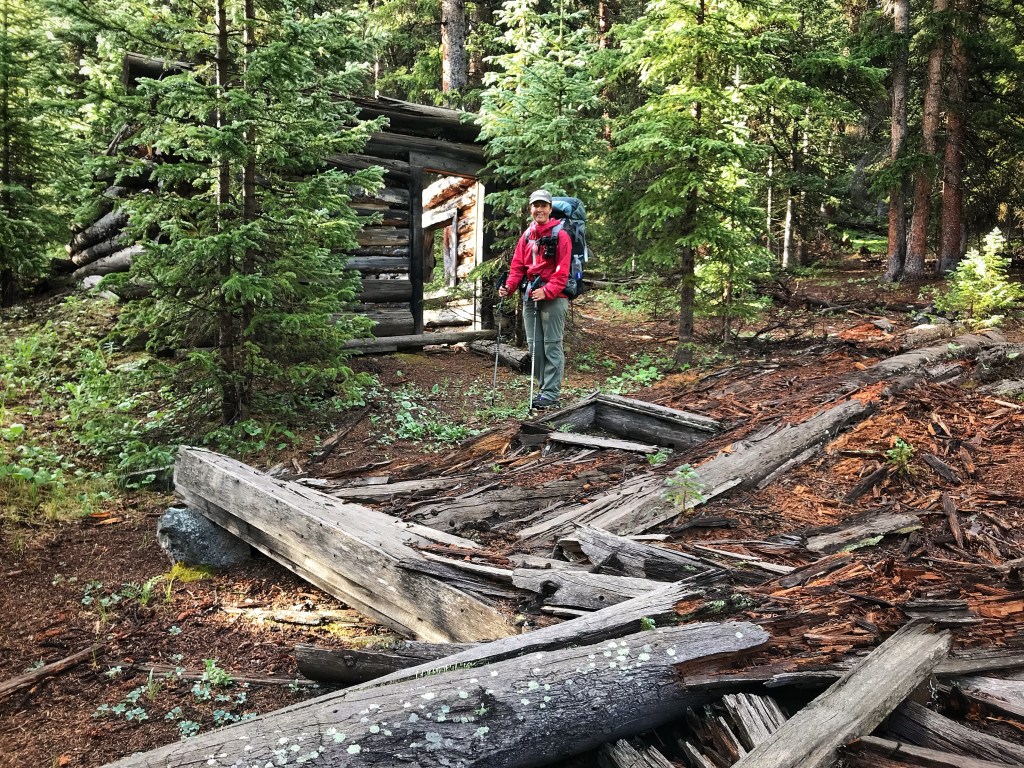 Because everything is still pretty soaked from last night, it takes us a little longer than normal to get going this morning. Once we do, we only get a few minutes down the trail before we run into an old log cabin from back in the day that is in pretty sorry shape now.