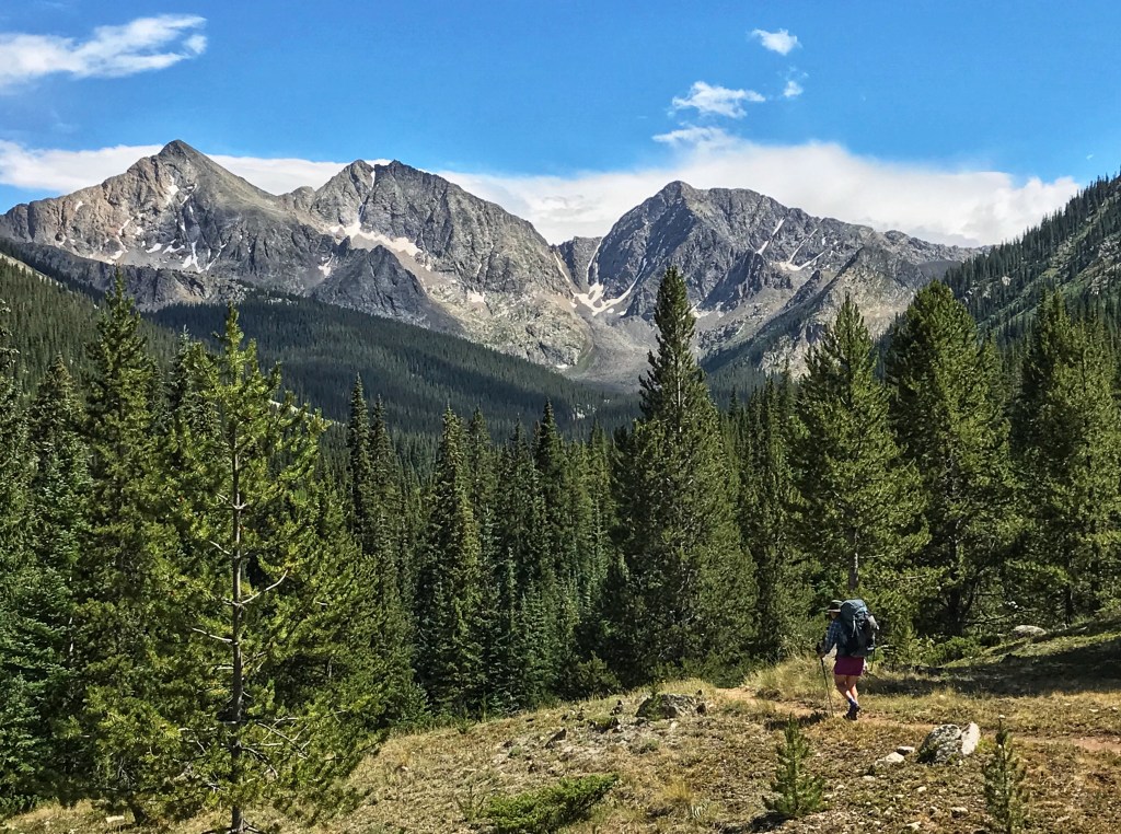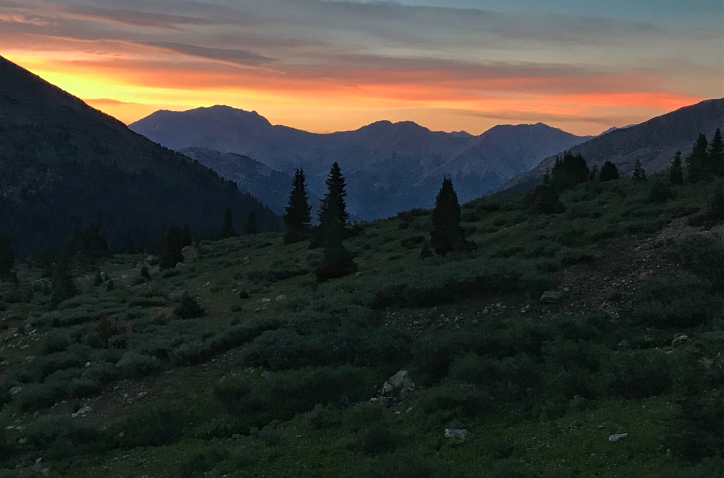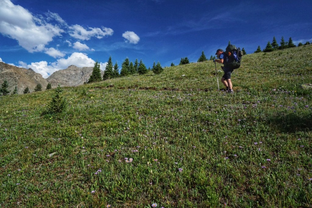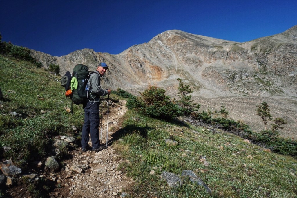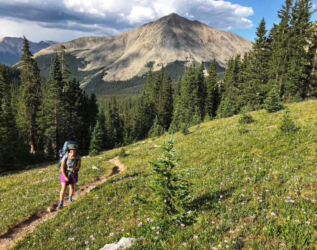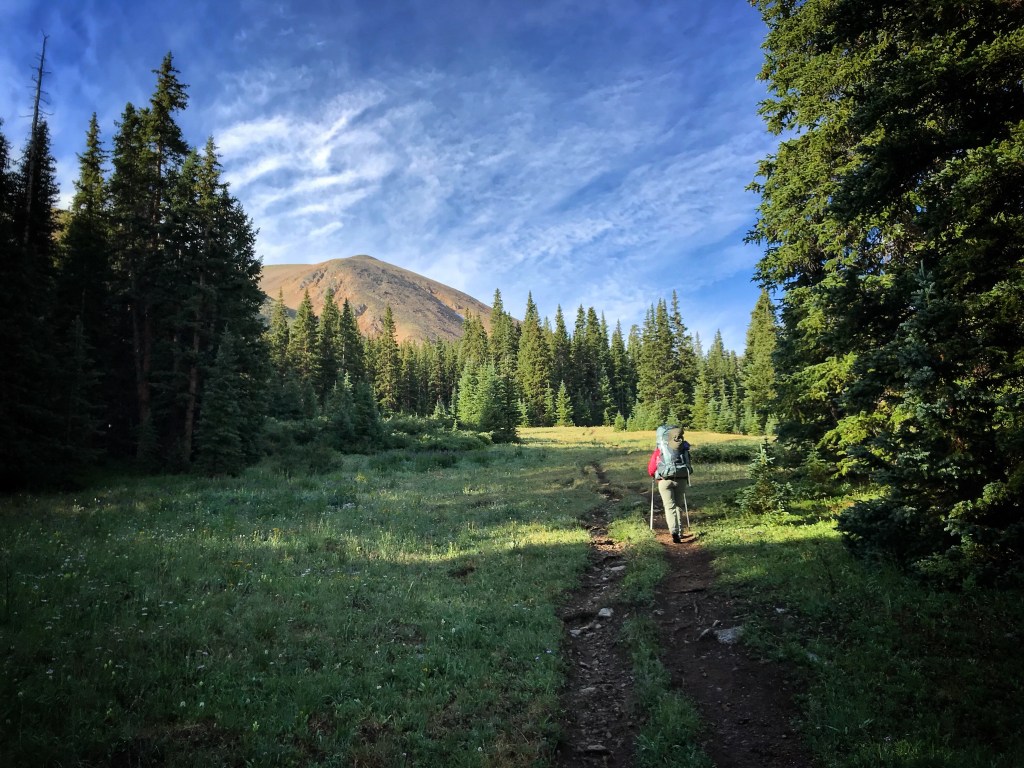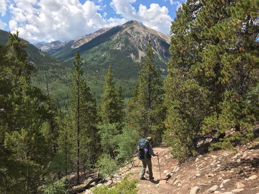 Our tent site has the pleasant sound of a creek rushing nearby, and, with the long day of hiking yesterday and the crazy thunderstorm, we both have the best night of sleep so far on the trail. That’s probably a blessing because we have a challenging day in store starting with a big ascent over Hope Pass followed by a long descent and then a final climb to Lake Ann. It’s our first full day in the Collegiates, and we are anxious to see if they are any more challenging than what we have experienced so far.