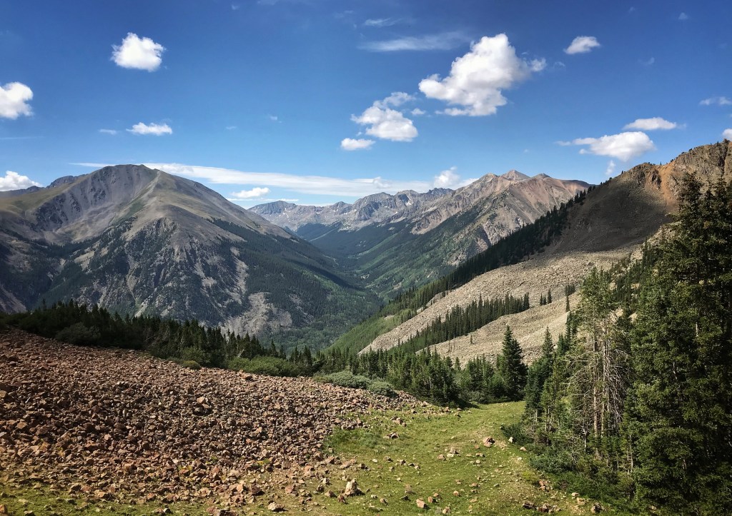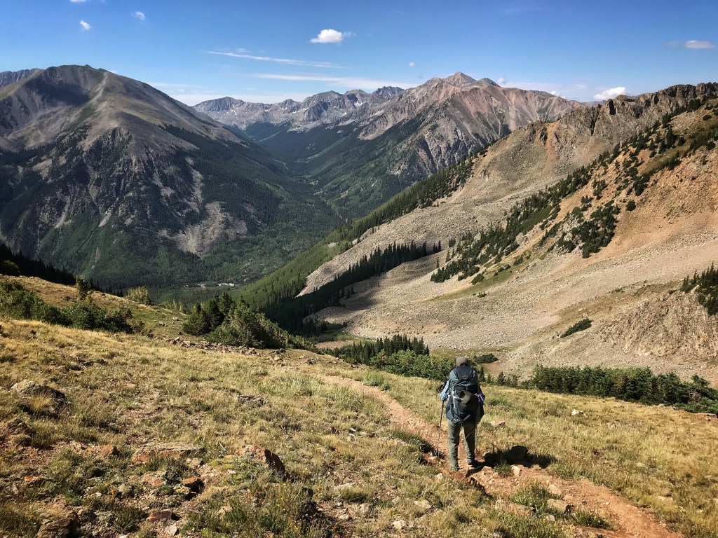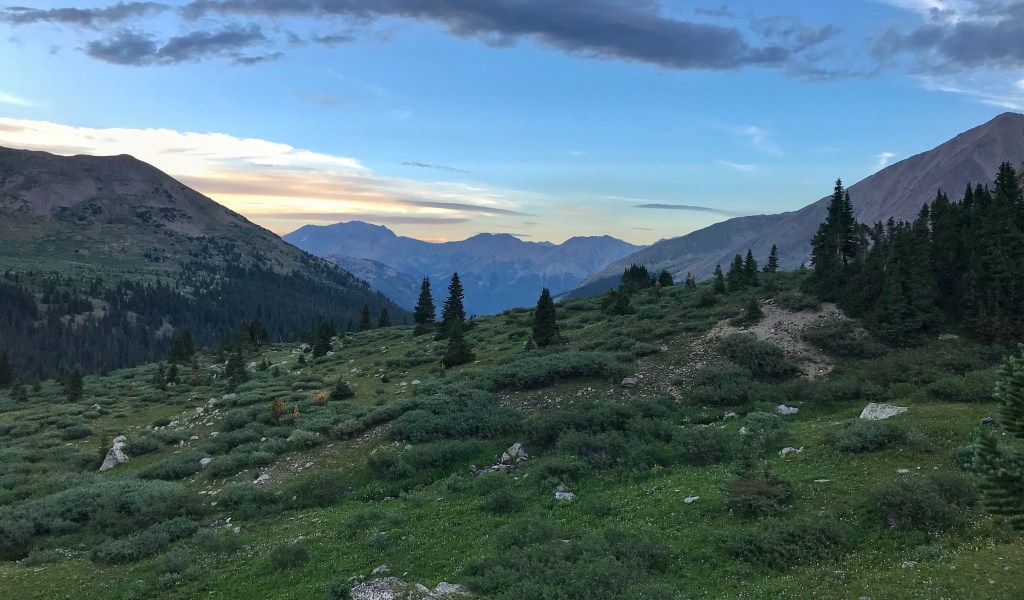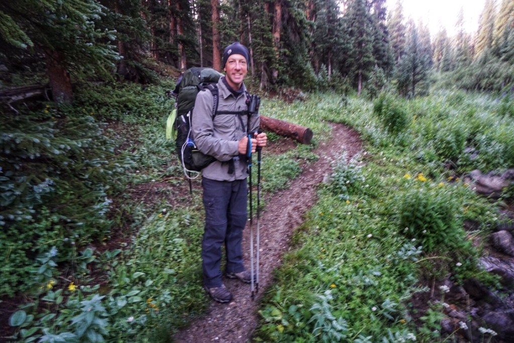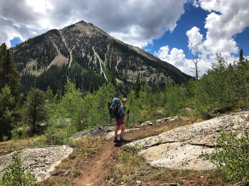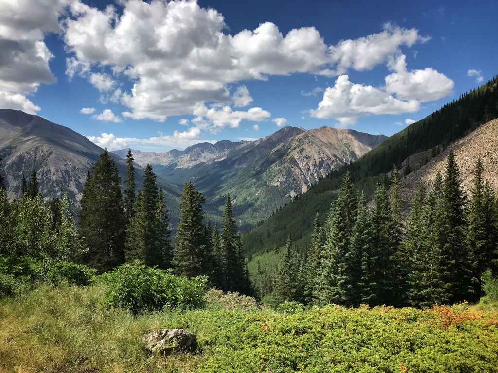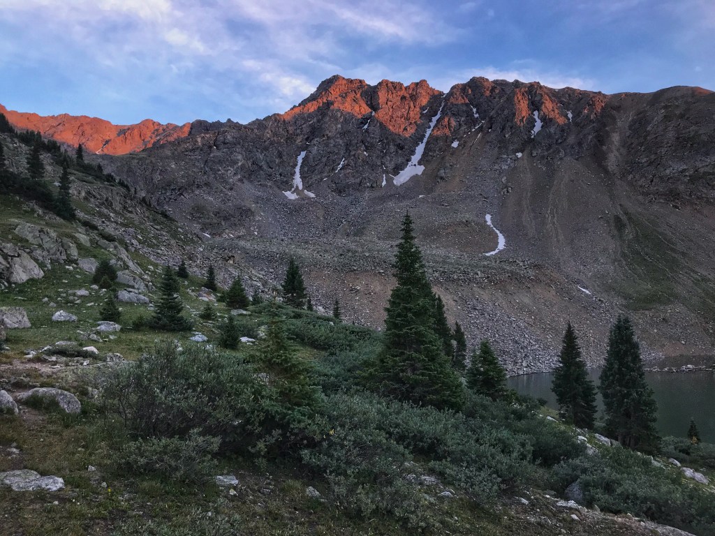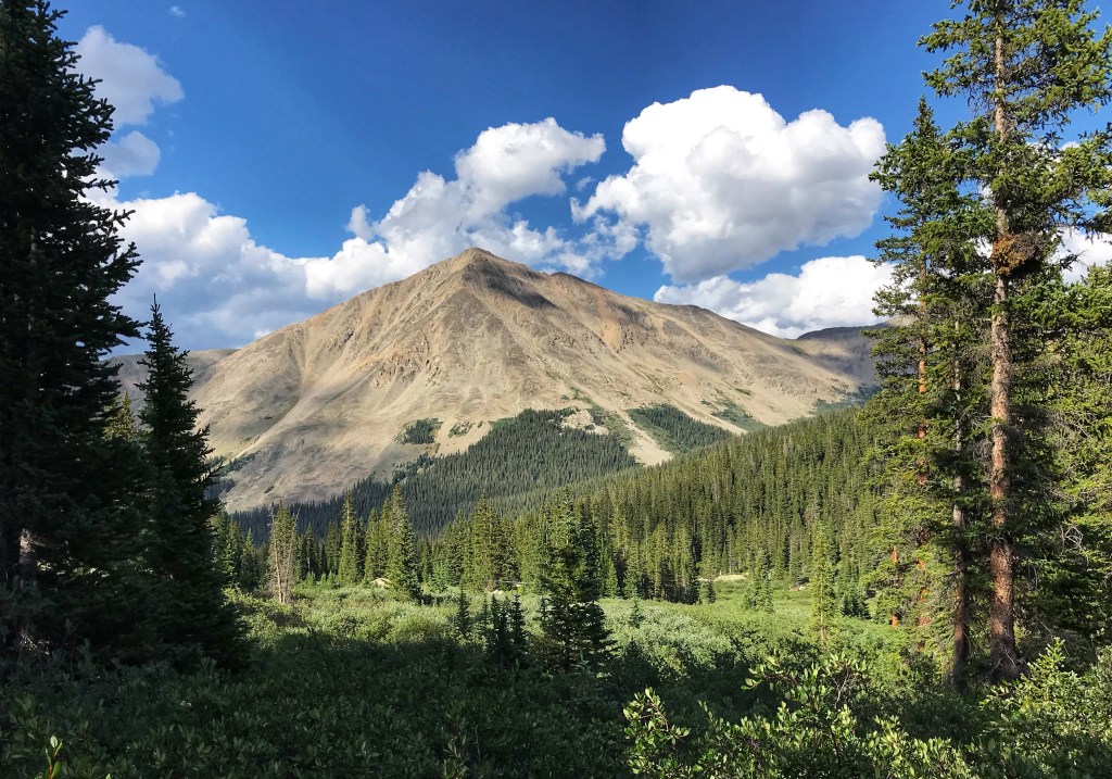 Our tent site has the pleasant sound of a creek rushing nearby, and, with the long day of hiking yesterday and the crazy thunderstorm, we both have the best night of sleep so far on the trail. That’s probably a blessing because we have a challenging day in store starting with a big ascent over Hope Pass followed by a long descent and then a final climb to Lake Ann. It’s our first full day in the Collegiates, and we are anxious to see if they are any more challenging than what we have experienced so far.