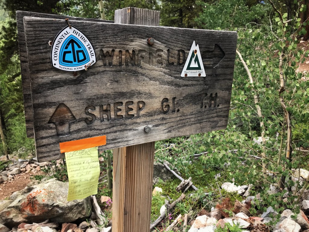 At the trailhead sign, we find a note for us from the gang. They camped last night further up the trail from where we are now. They are at least a half day ahead of us, so chances are most likely that we will not see them again until Salida.