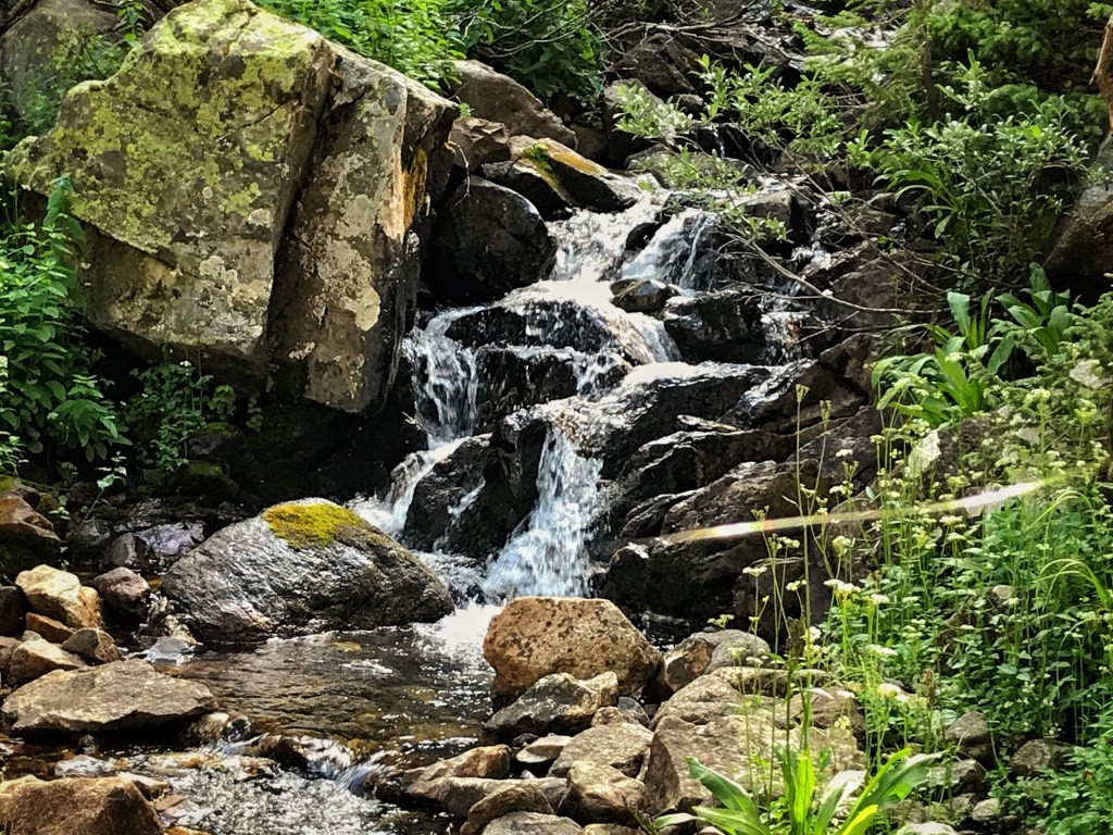 Sure enough, there is a young male moose with velvety antlers feasting on the willow bushes on the far shore of the lake. Unfortunately, there’s no way for us to get very close to the moose, so we go off-trail to get to the best vantage point we can and enjoy watching him through our binoculars. We had heard that there was a chance of seeing moose here in Colorado, but this is our first time seeing one on the trail. How cool!