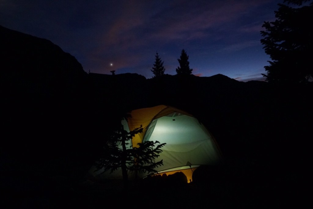 A crescent moon with a gauzy penumbra rises above the ridge to the right of the pass as the first stars of Sagittarius appear above the horizon. Matt aims his Starwalker app at the sky and thinks we can see Saturn, Jupiter and possibly Pluto in a line. This is an A+ campsite as far as we are concerned.