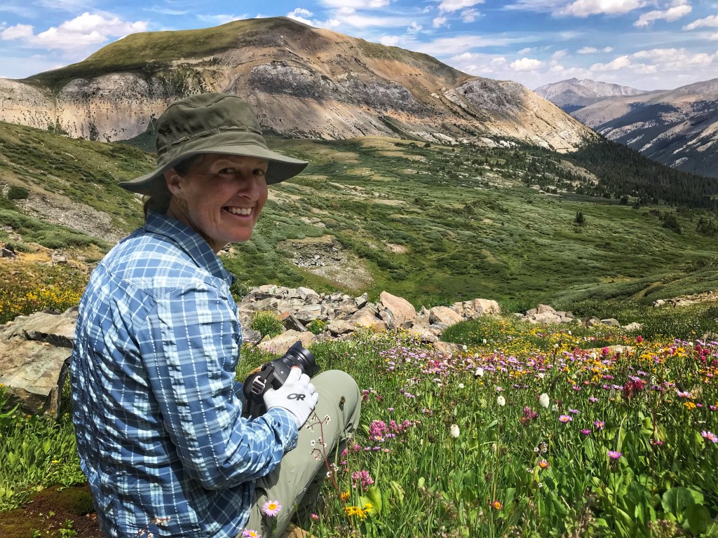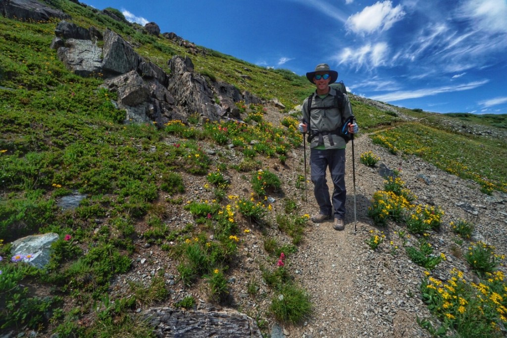 As we head down the trail, we couldn’t be happier with our decision. We come to a spot that is so dense with wildflowers that we drop our packs and pull out the cameras to play. The combination of hot pink Indian Paintbrush, lavender Aster and yellow daisies is stunning as a foreground subject to the majestic mountain peaks behind. We practically lay down on the trail in hopes of adequately capturing the spectacular scene. What fun this is when you are not worried about making big miles!