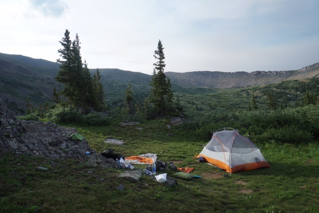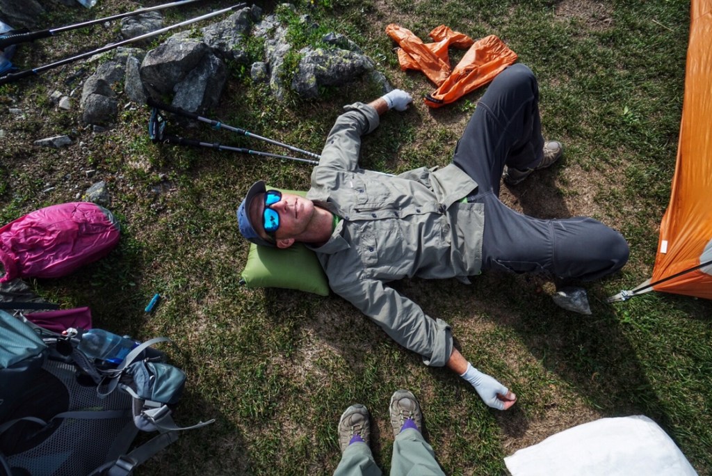 We hike on until we find a campsite in a grassy bowl just below the trail and enjoy a relaxing and rejuvenating afternoon in camp. Matt finds the perfect spot to sprawl out in the grass, and he looks like he has died and gone to heaven.