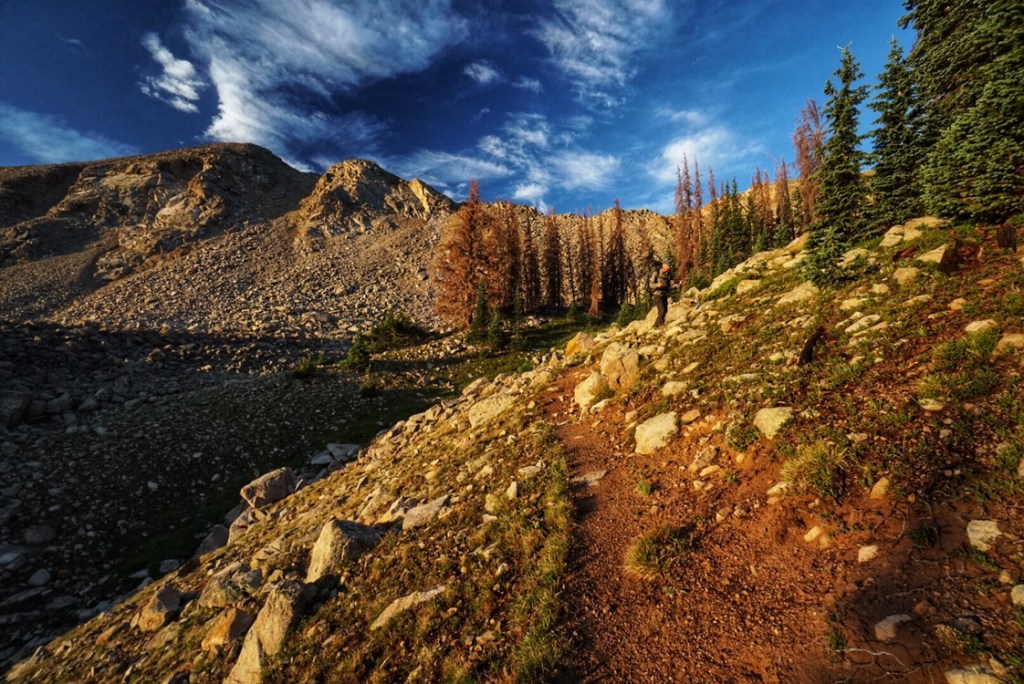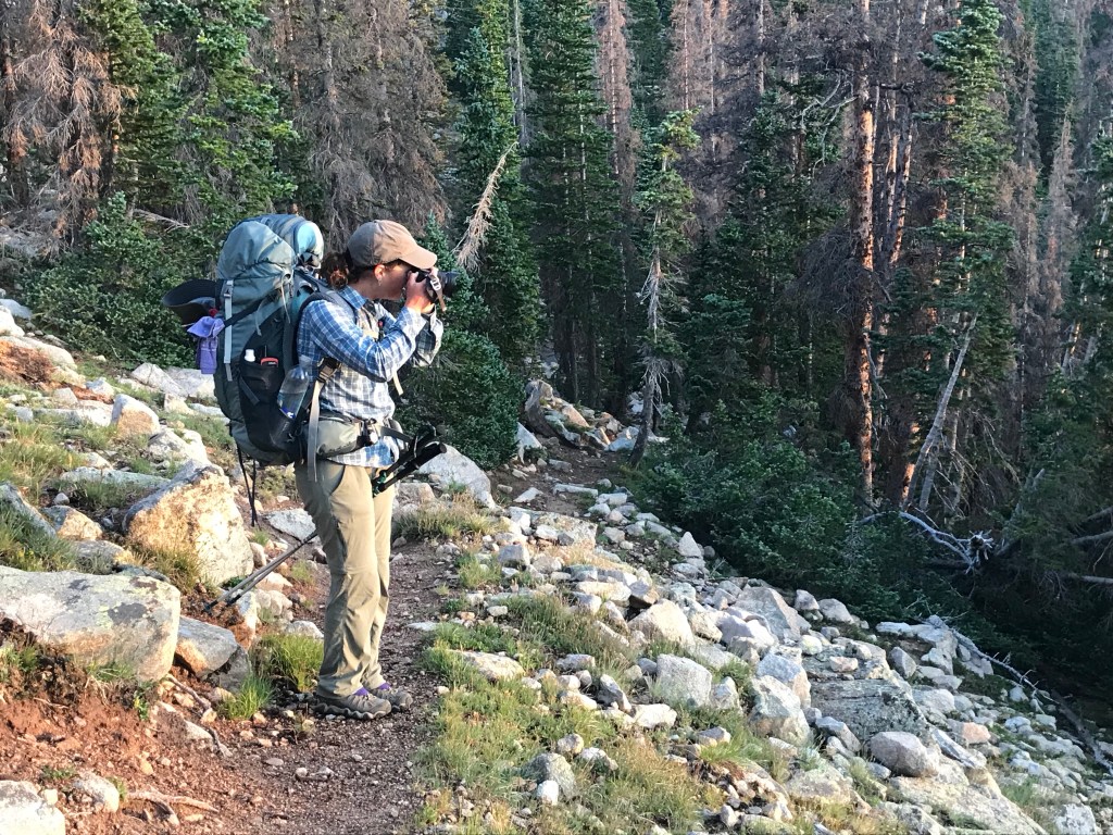 We hike several more miles before running into our first hikers of the day. We are surprised not to encounter more day hikers and mountain bikers since it is a Sunday. The couple we meet are from Pennsylvania and are hiking the Collegiate Loop. They, too, validate what we have heard about the older East route and are excited to finally climb out of the trees and see the mountains above tree line. We see lots of birds flying around and eating insects, mostly mountain bluebirds and Clark’s nutcrackers, both of which are flashy flyers.