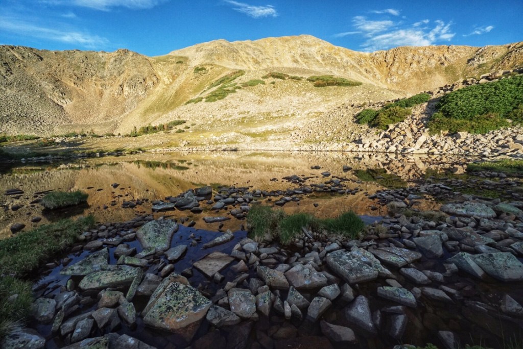 As we climb toward the ridge we come across two mountain tarns, one of which is glass calm and has an amazing reflection.
