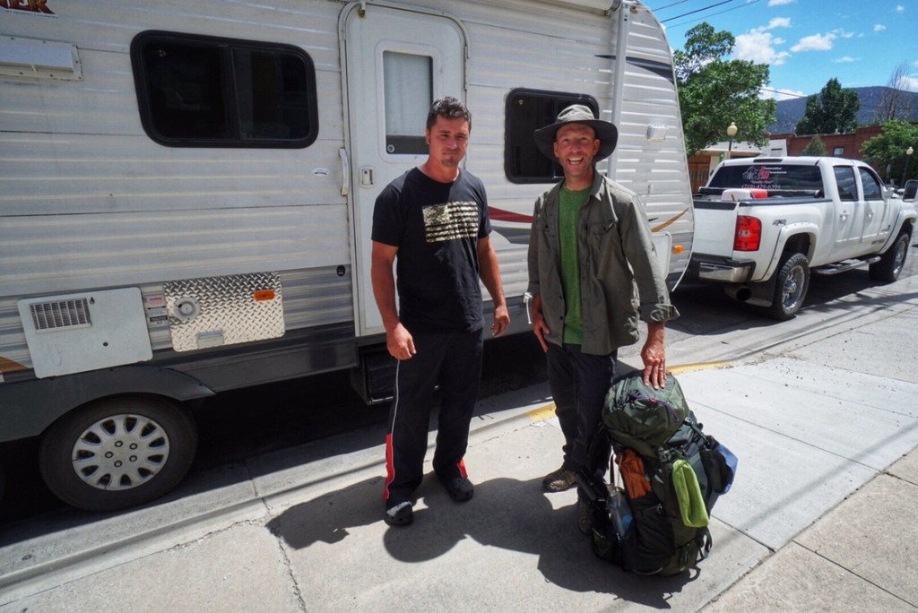 It’s time to hitch a ride down to Salida which is 22 miles away, so we put our packs on and our big, friendly smiles and edge out to the exit in the direction of Salida. We stick our thumbs out for less than 5 minutes when a big Ford truck pulling a big trailer and a smaller one behind that slows down, rolls down the window and the driver asks where we are headed. He tells us that he had a cousin who hiked the CDT last year and that he picked him up and helped him out, so he’s familiar with hikers like us in need of a lift. Alison’s excited because she gets to see the inside of the trailer, a future retirement dream of ours.