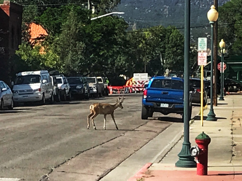 He wanders about, finally jumping over a fence and disappearing into someone’s backyard. When we look down the alley to see where he went, we see that there is a doe hanging out there, too. We’re guessing this is not the first time these deer have hoofed it in downtown Salida.