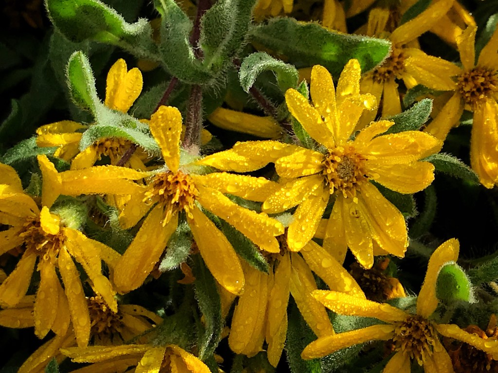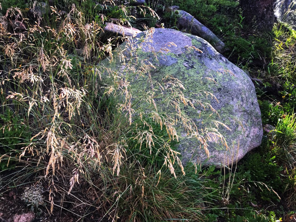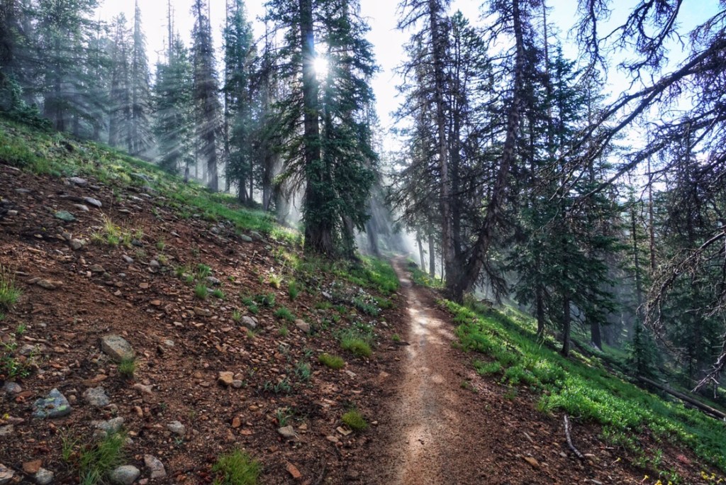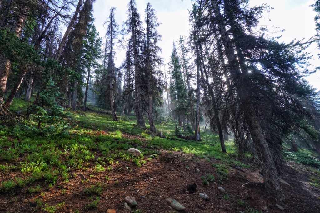 The air is surprisingly cool at the pass, but we are 5000+ feet above Salida. It’s time to put our feet on the trail and get going. We hike above the pass through green forest on a path of red pine needles as the sun plays tricks with the clouds that are starting to burn off. The wildflowers are blooming everywhere, and the morning dew from last night’s intense rain is still clinging to everything.