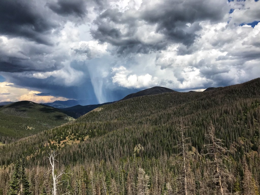 We are all watching the sky to the east turning ominously gray, so we keep a steady pace as the occasional rumble of thunder rolls in. As we start to crest a hill we see a huge spout of water off in the distance spiraling to earth and hope it does not come our way.